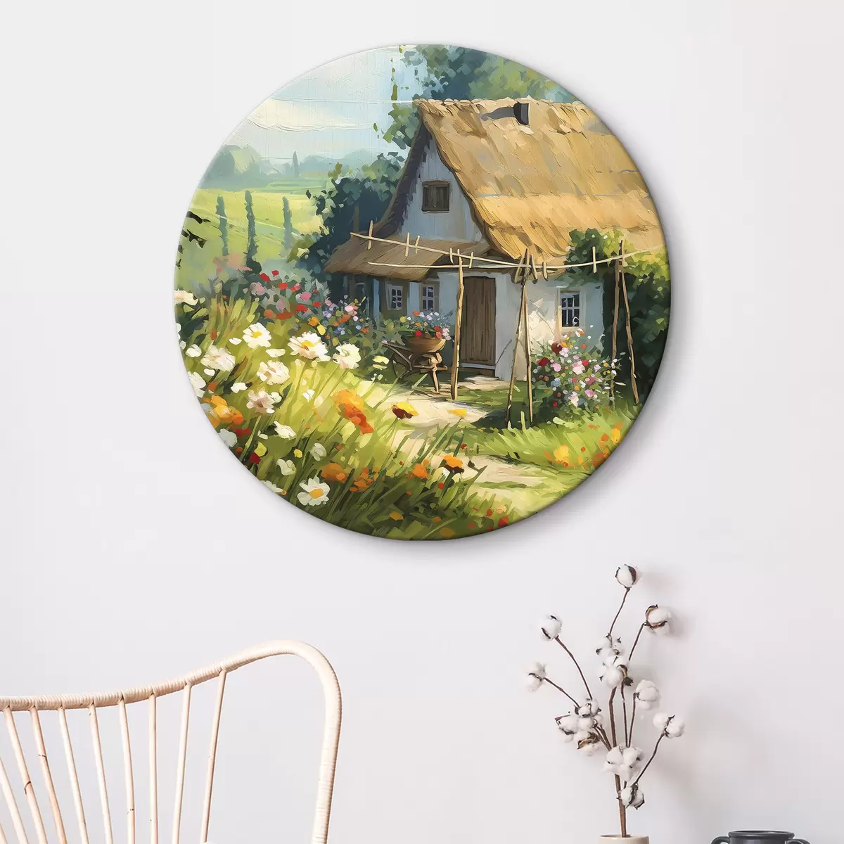 Quadri rotondi Casa di paese con giardino, fiori estivi, pittura a olio, pennellate, campo, stile rustico r38491