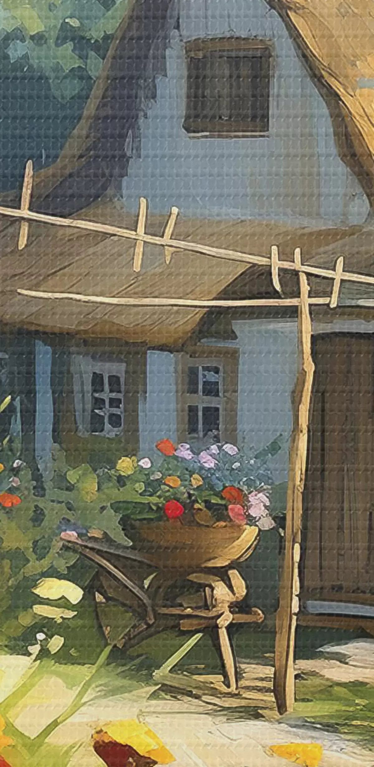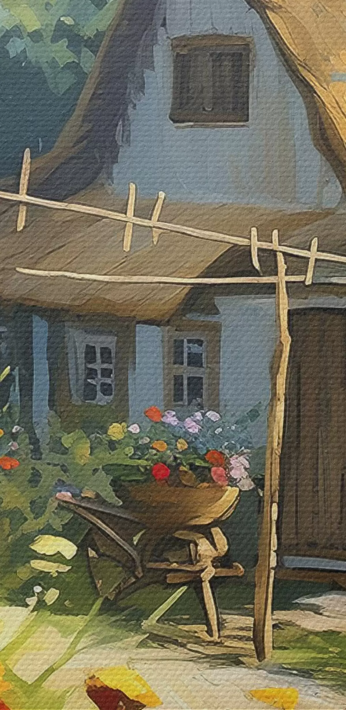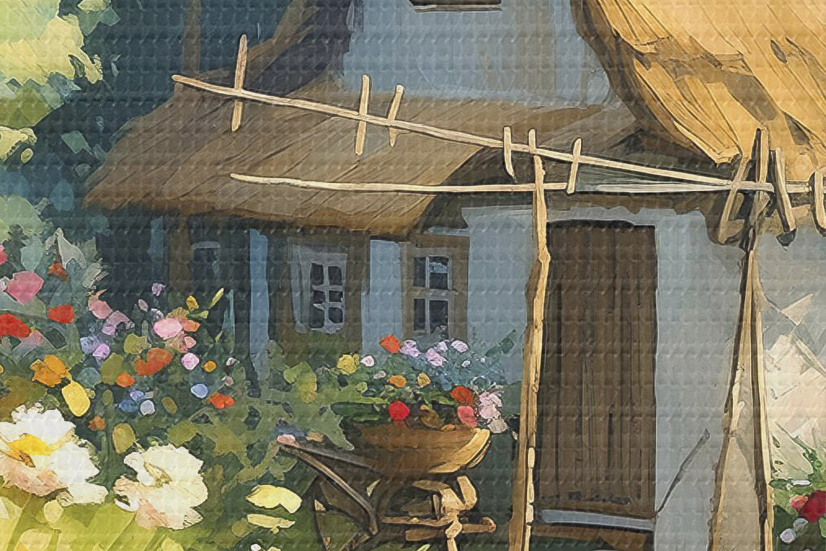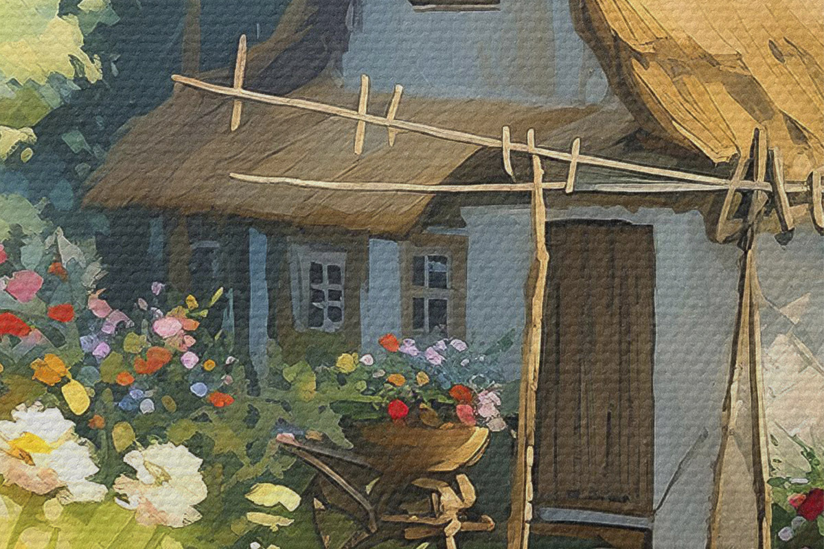 Immagine Casa di paese con giardino, fiori estivi, pittura a olio, pennellate, campo, stile rustico Nr r38491