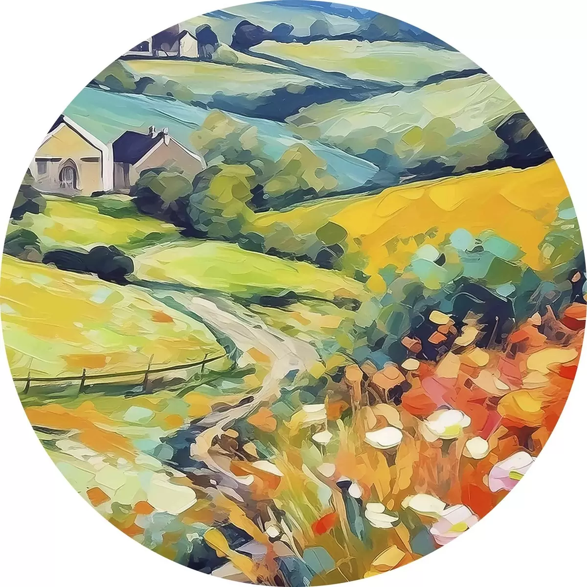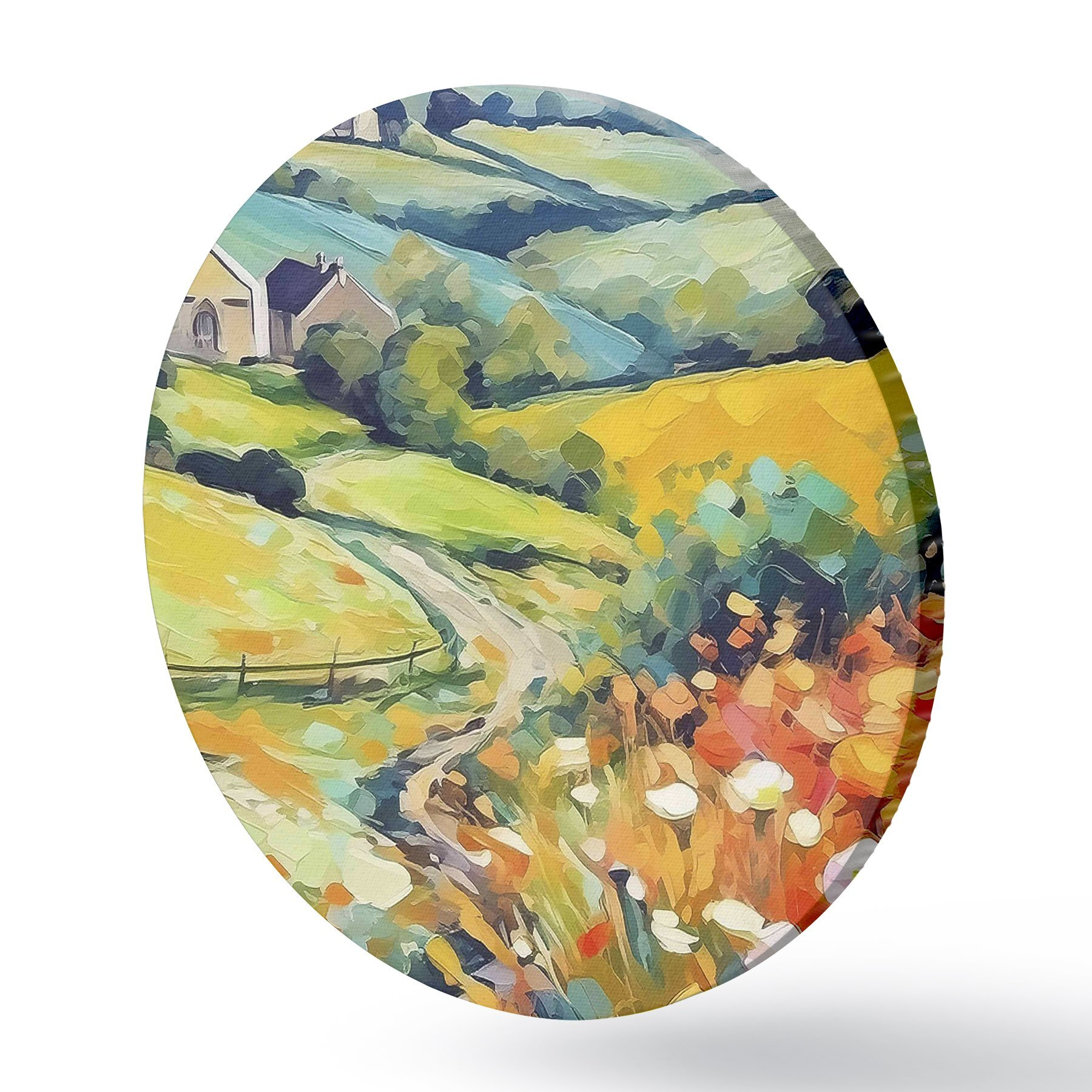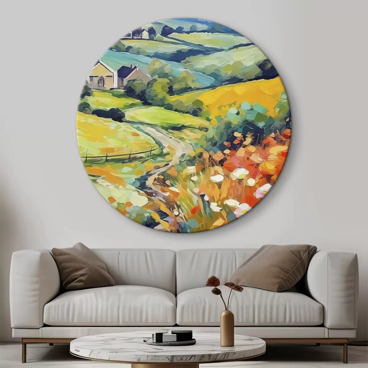 Quadri rotondi Un dipinto che mostra un paesaggio con case e campi r38501