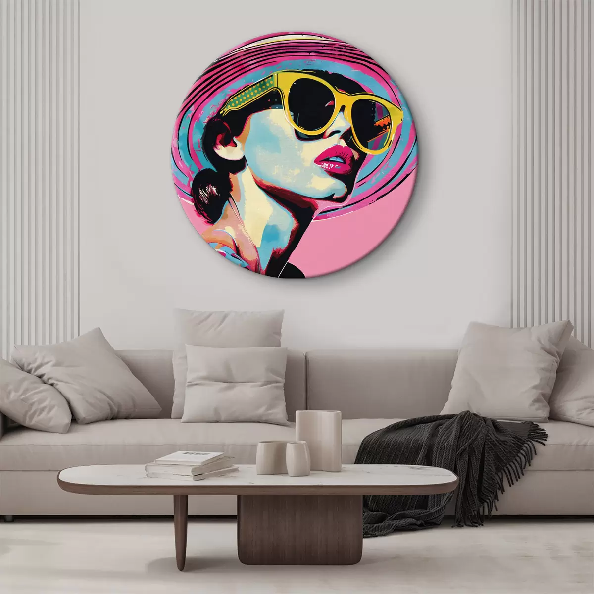 Quadri rotondi Ritratto colorato di una donna elegante con gli occhiali da sole r38508