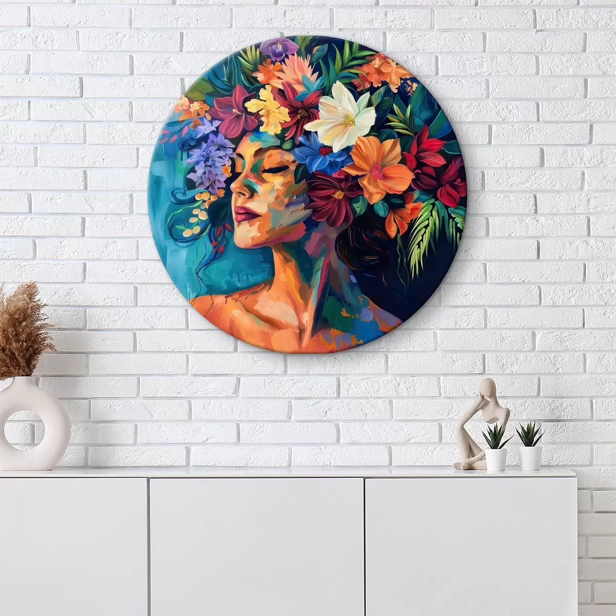Quadri rotondi Un dipinto che raffigura una donna con fiori tra i capelli r38574