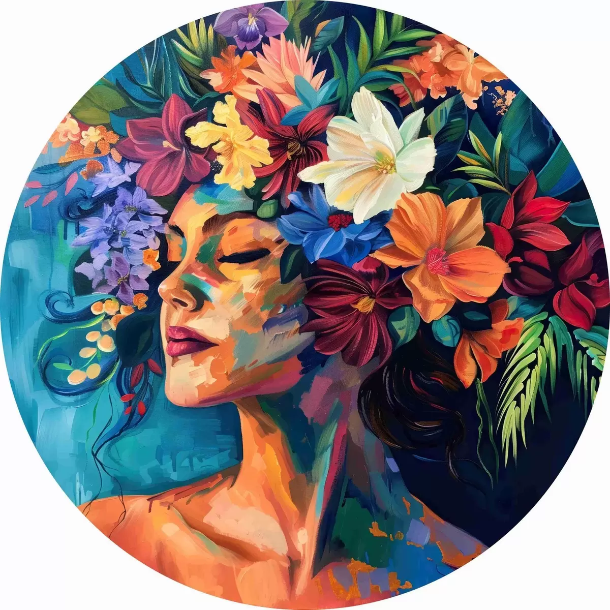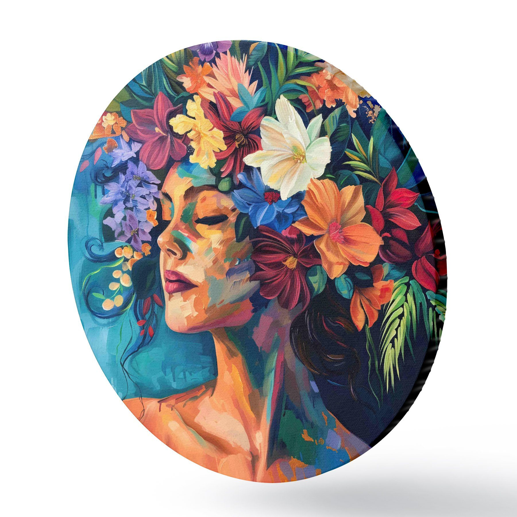 Quadri rotondi Un dipinto che raffigura una donna con fiori tra i capelli r38574