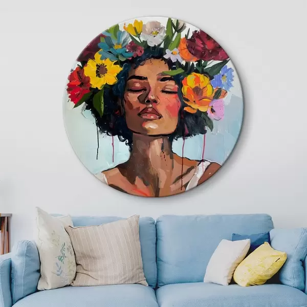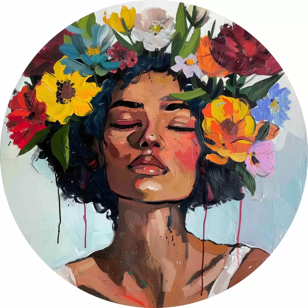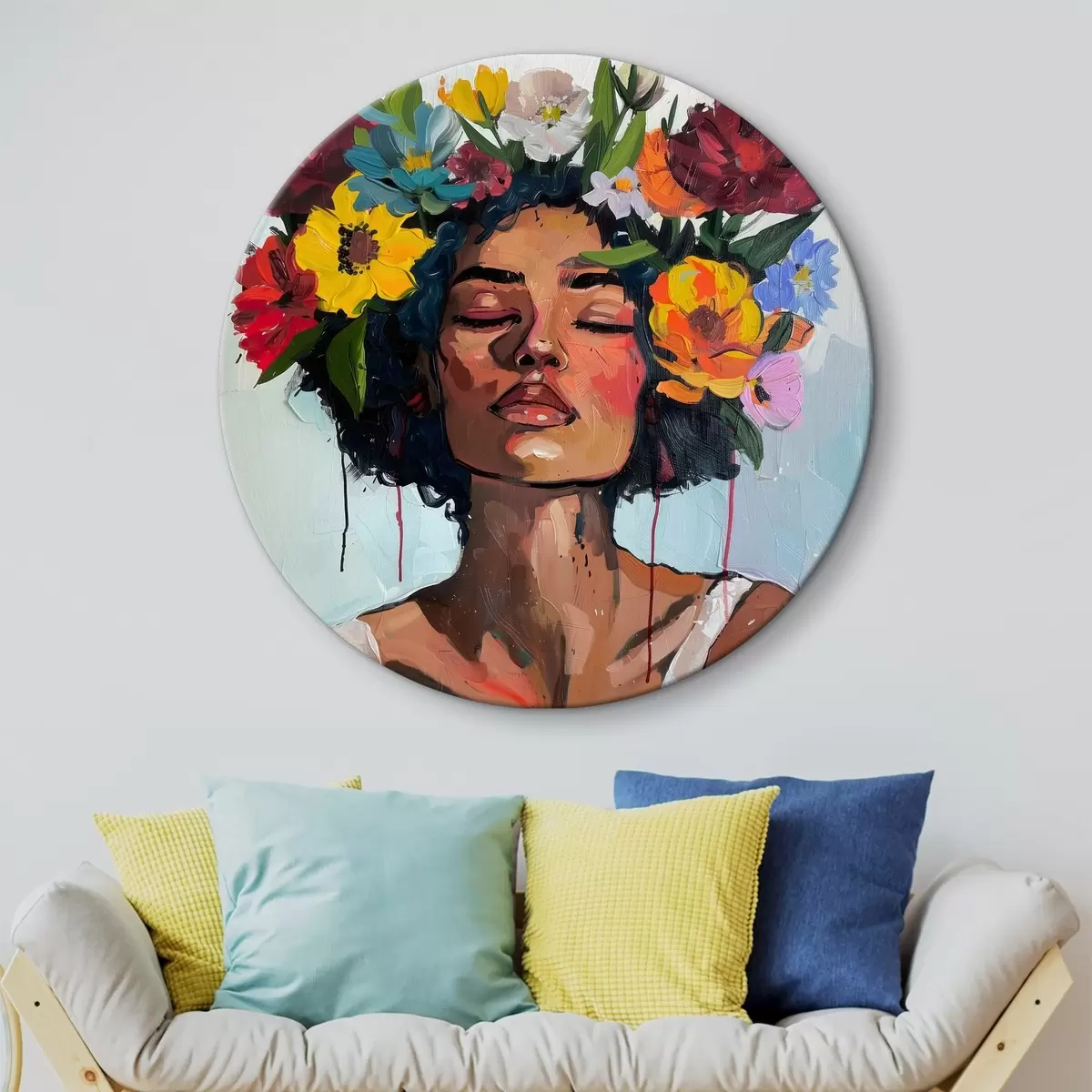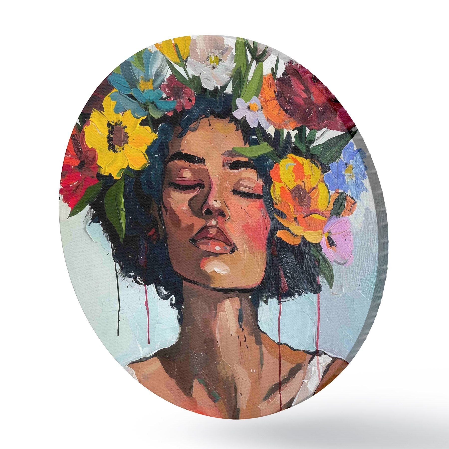Quadri rotondi Un dipinto che raffigura una donna con fiori tra i capelli r38575