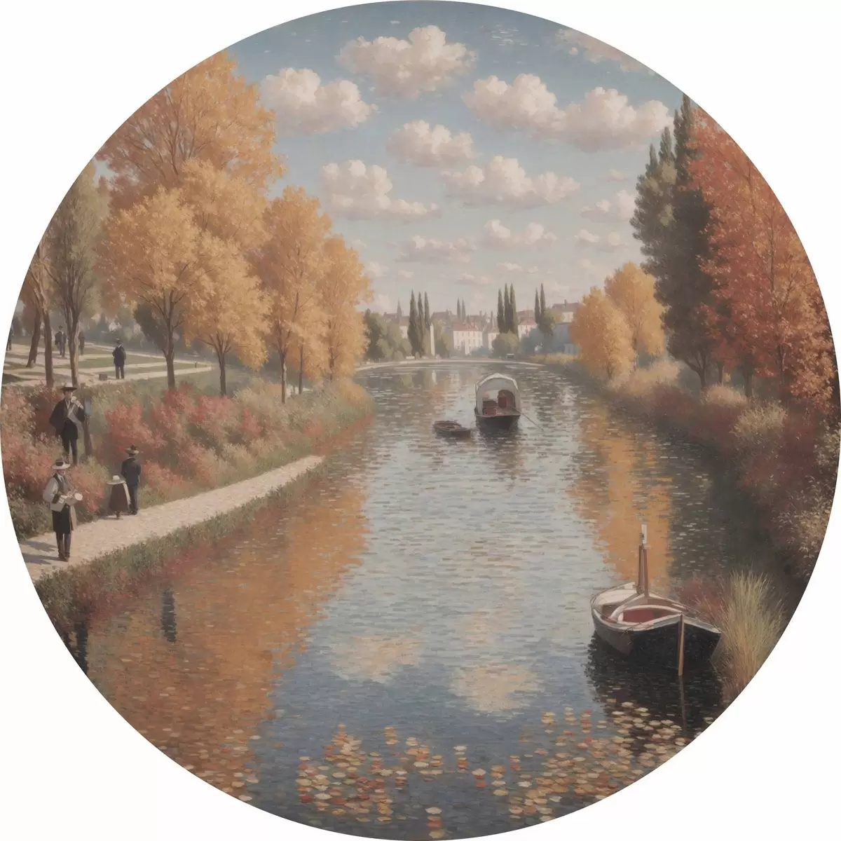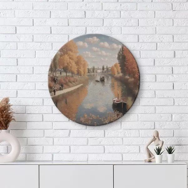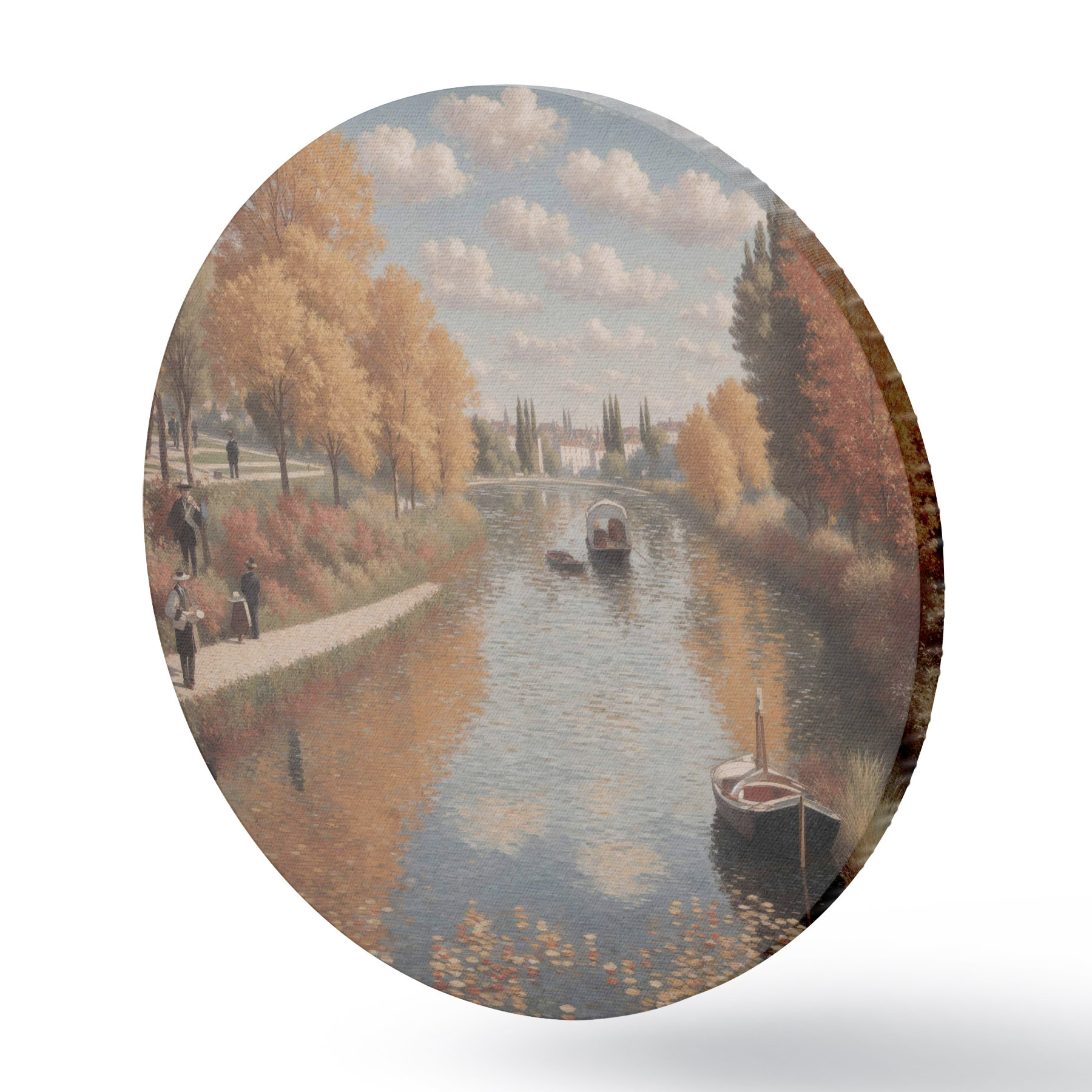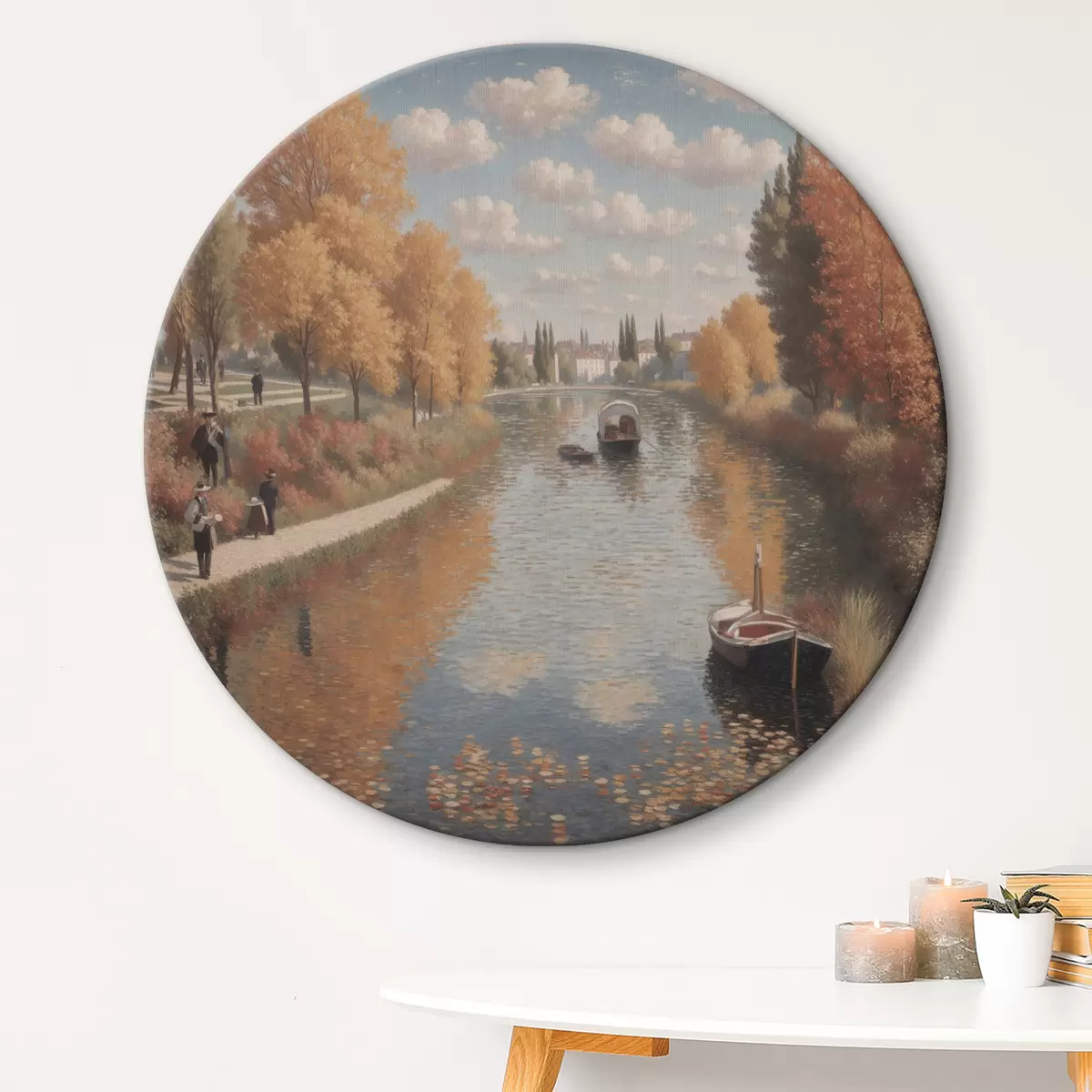 Quadri rotondi Un dipinto di un fiume con barche e persone. r38598