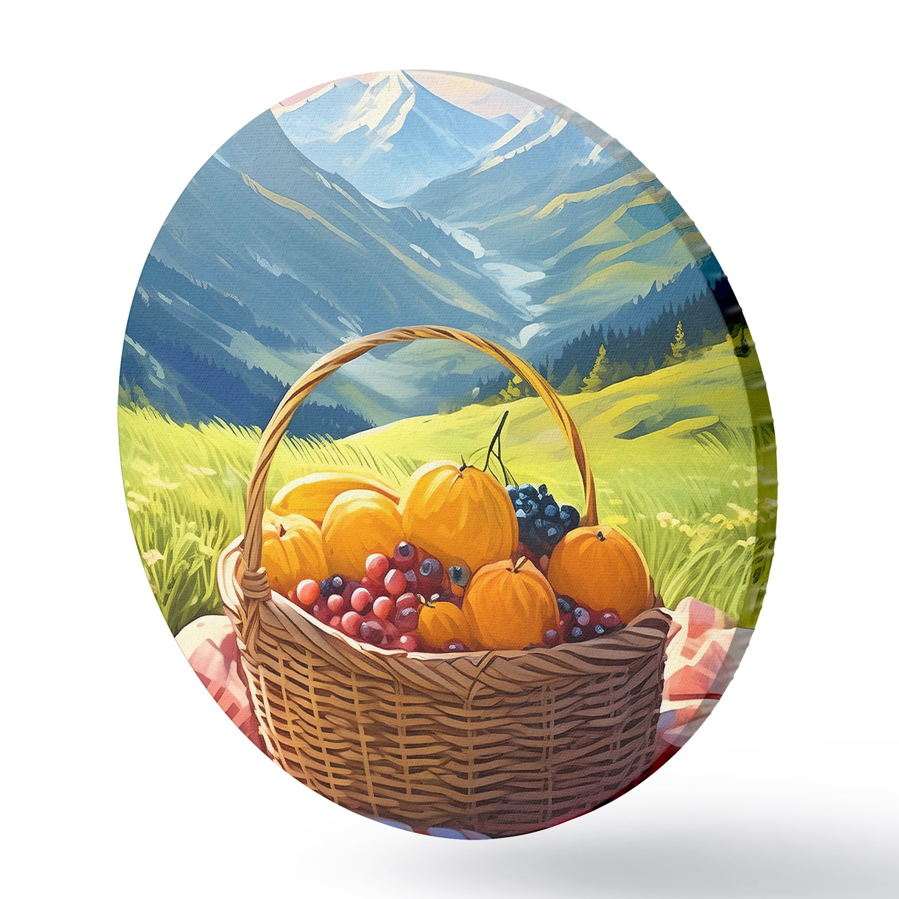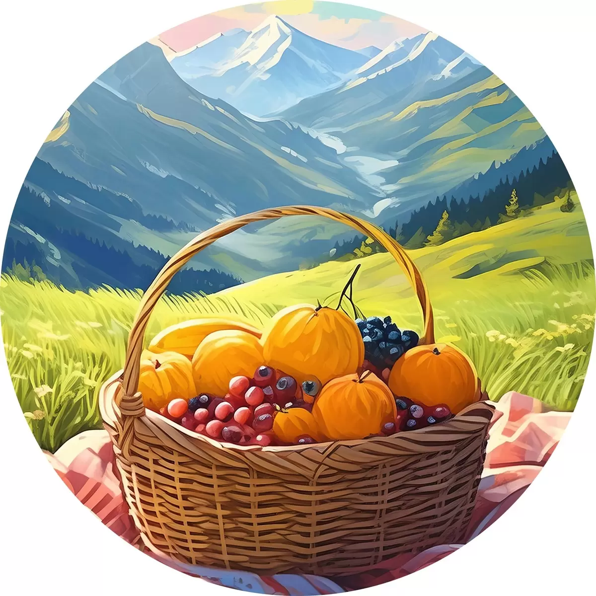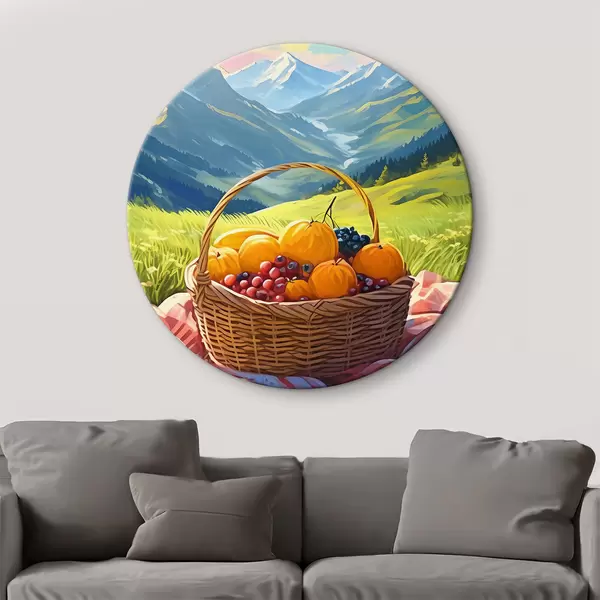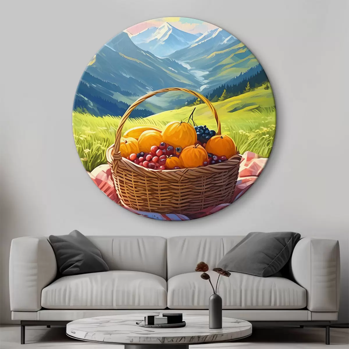Quadri rotondi un cesto di frutta su un prato in montagna r38654