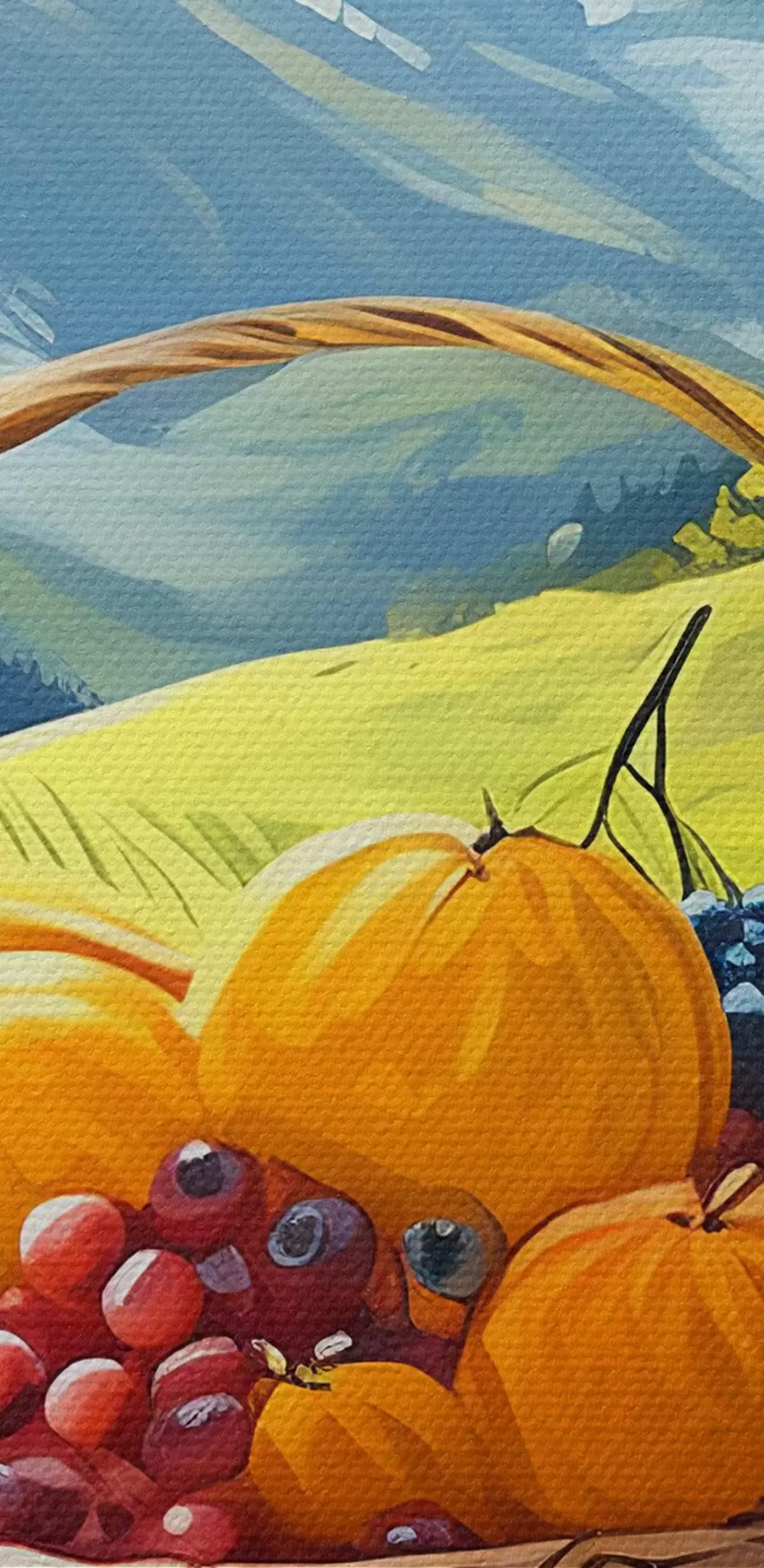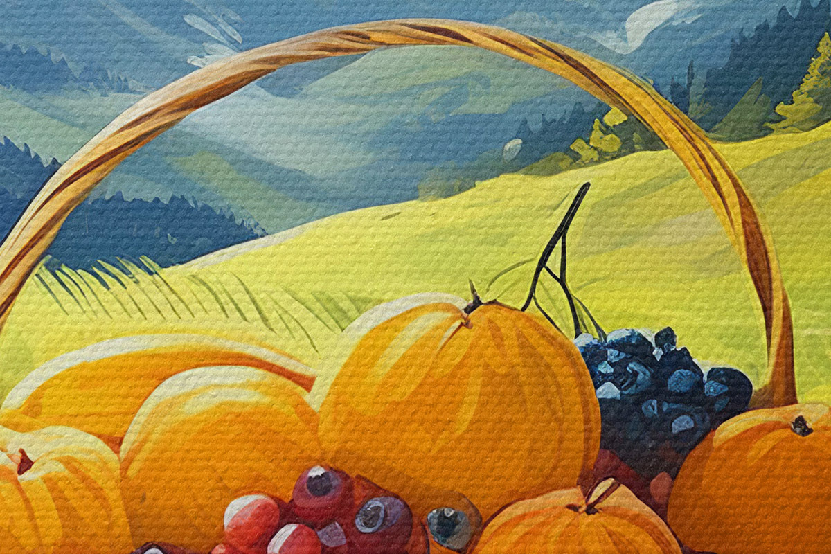 Immagine un cesto di frutta su un prato in montagna Nr r38654