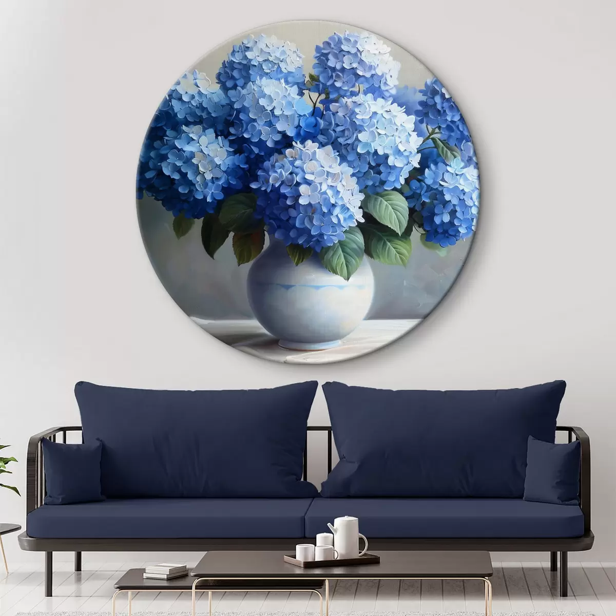 Quadri rotondi Bouquet di ortensie blu in un vaso bianco r38696