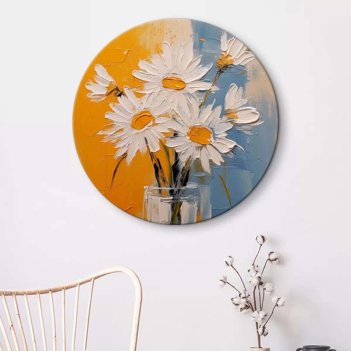 Quadri rotondi Margherite bianche in un vaso di vetro su sfondo blu e giallo, imitazione della pittura a olio, tratti grandi r38907