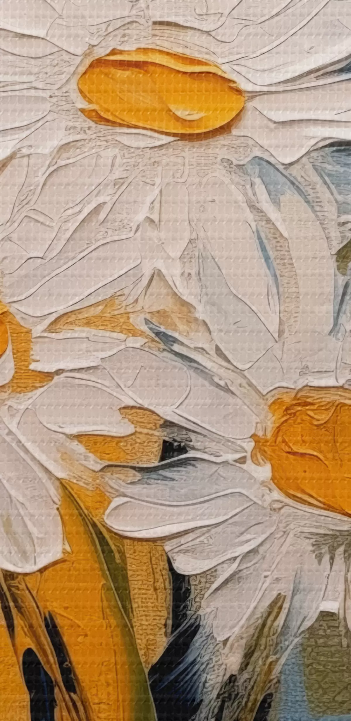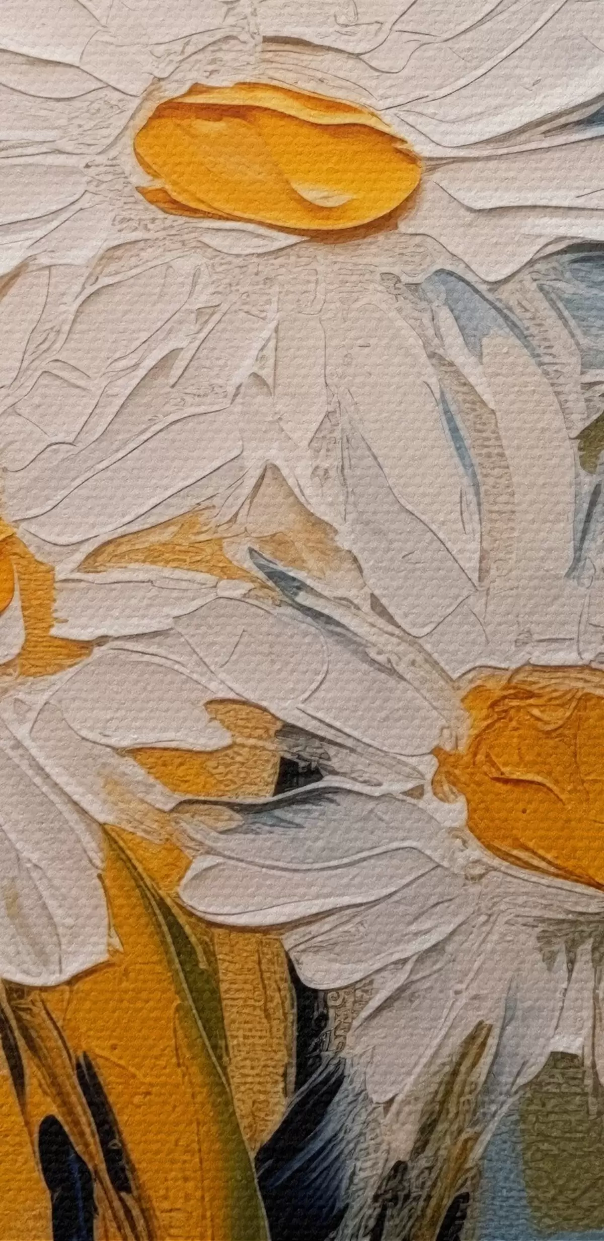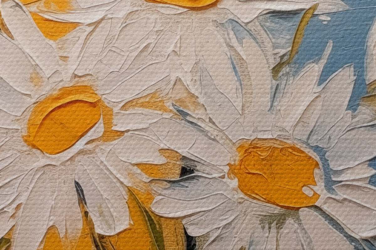 Immagine Margherite bianche in un vaso di vetro su sfondo blu e giallo, imitazione della pittura a olio, tratti grandi Nr r38907