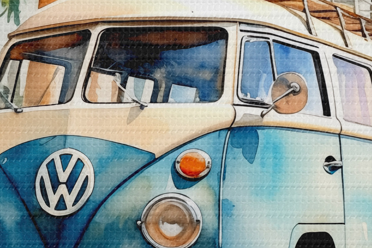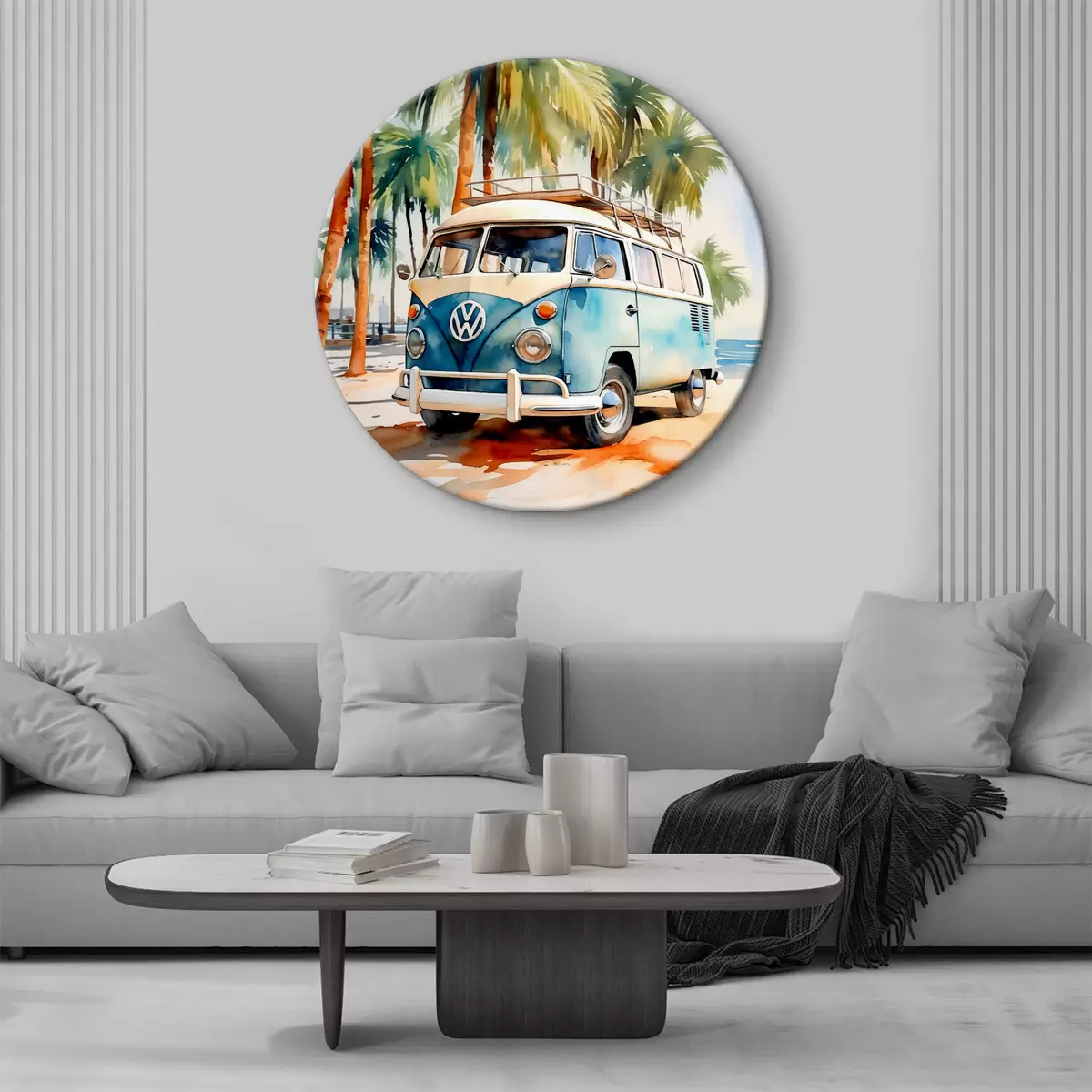Quadri rotondi Un'auto da viaggio è parcheggiata sulla spiaggia su uno sfondo di palme acquerellate r38911