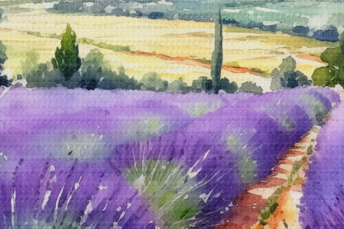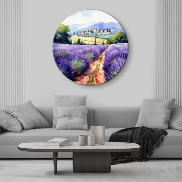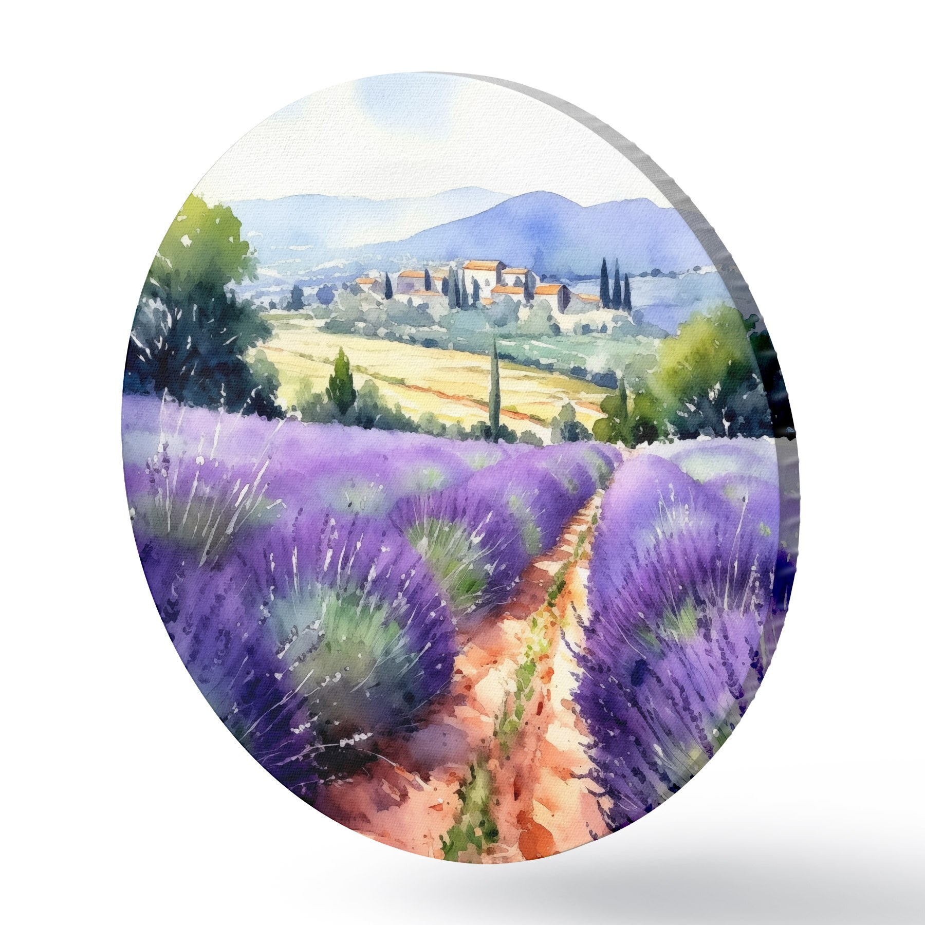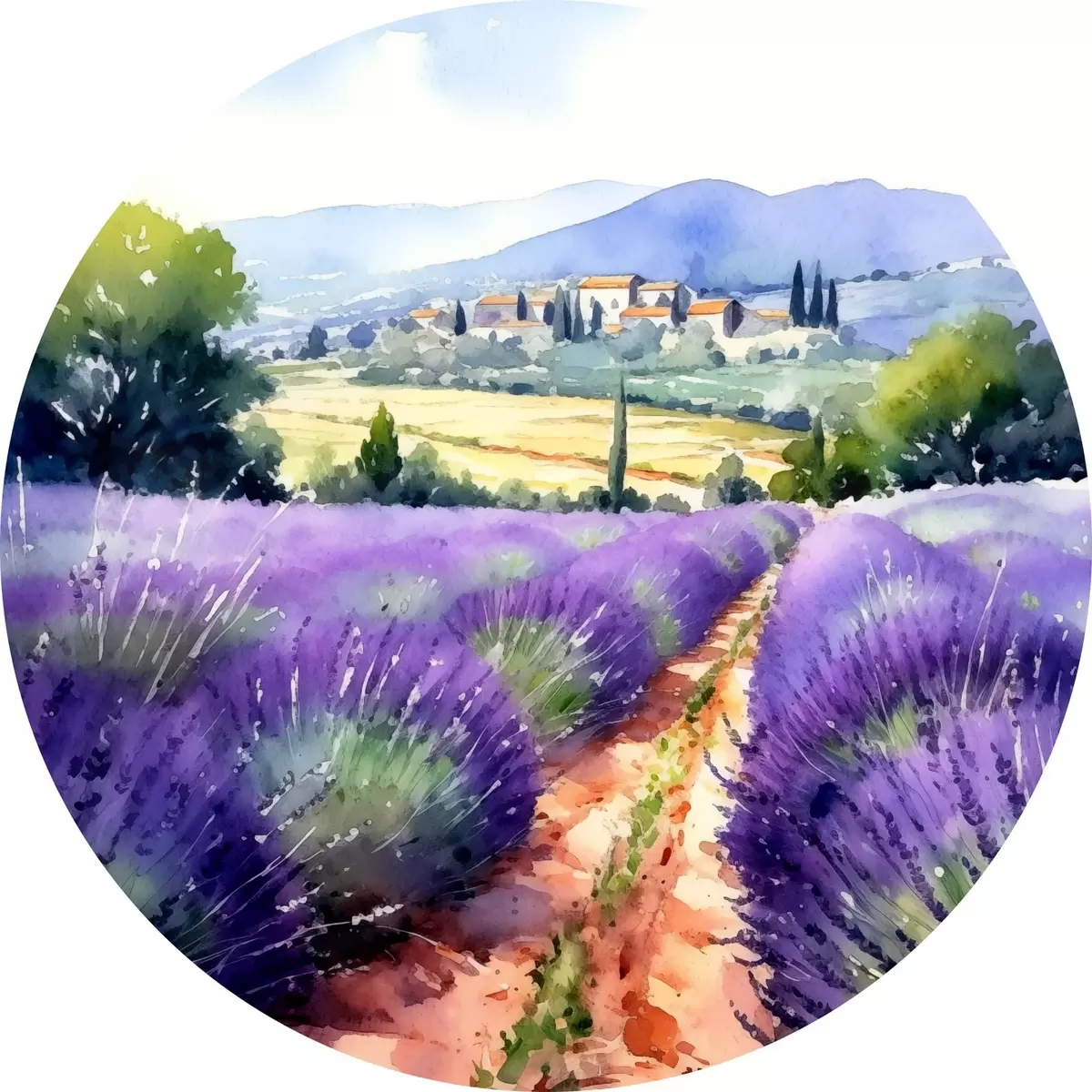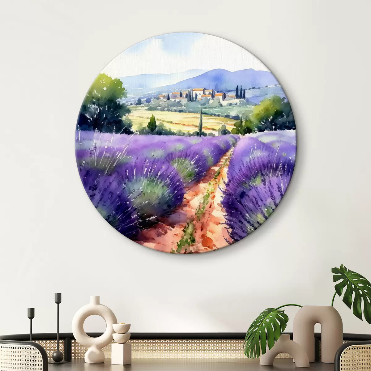 Quadri rotondi Campo di lavanda dell'acquerello su uno sfondo di montagne e campagna r38913
