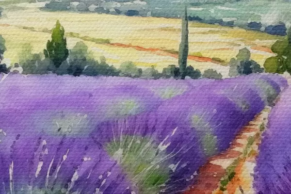 Immagine Campo di lavanda dell'acquerello su uno sfondo di montagne e campagna Nr r38913