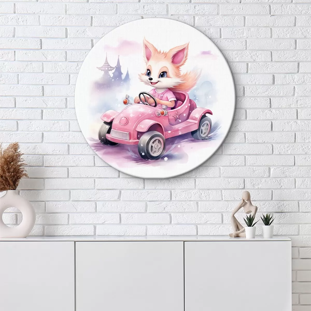 Quadri rotondi La piccola volpe cavalca un'illustrazione ad acquerello per bambini in un'auto rosa r38943