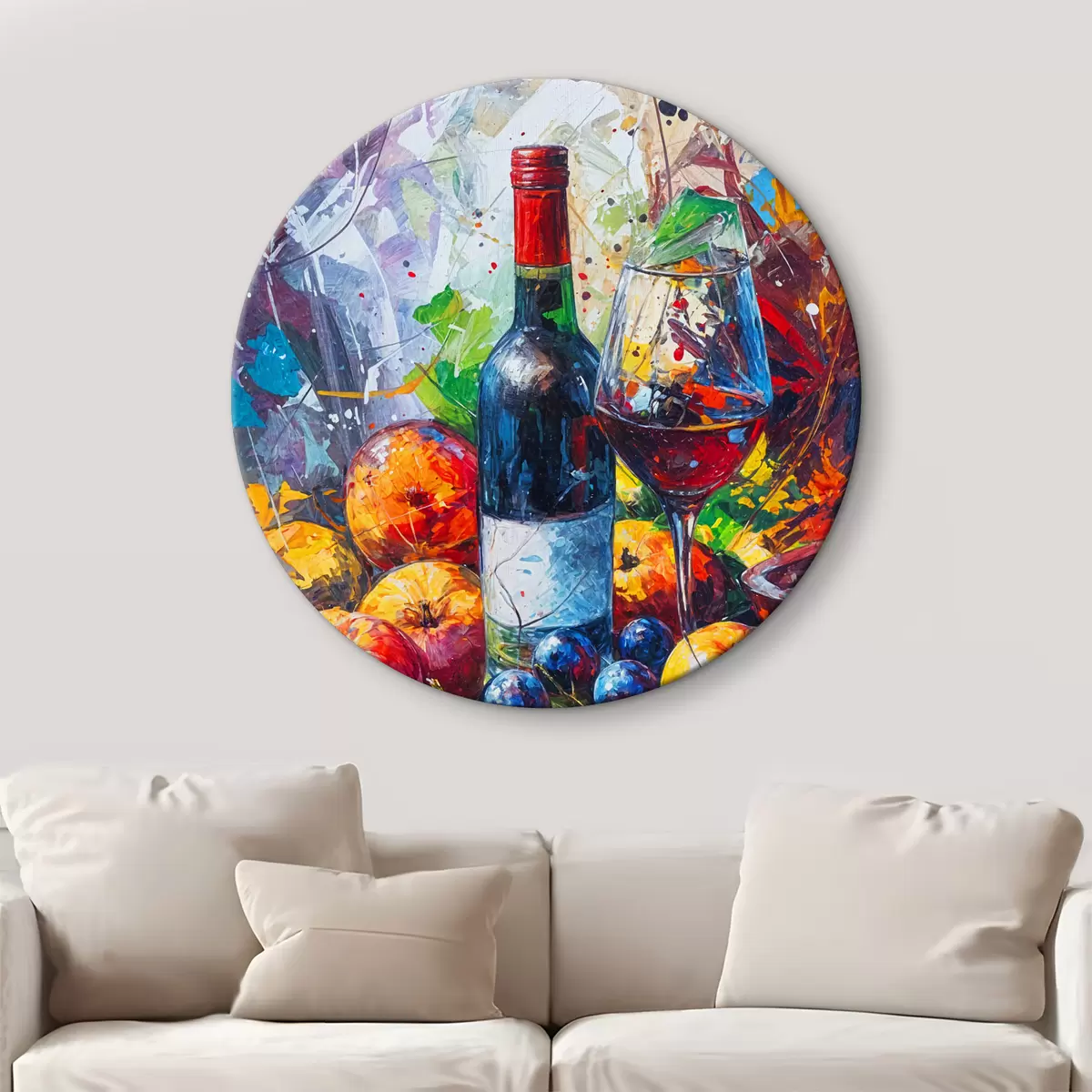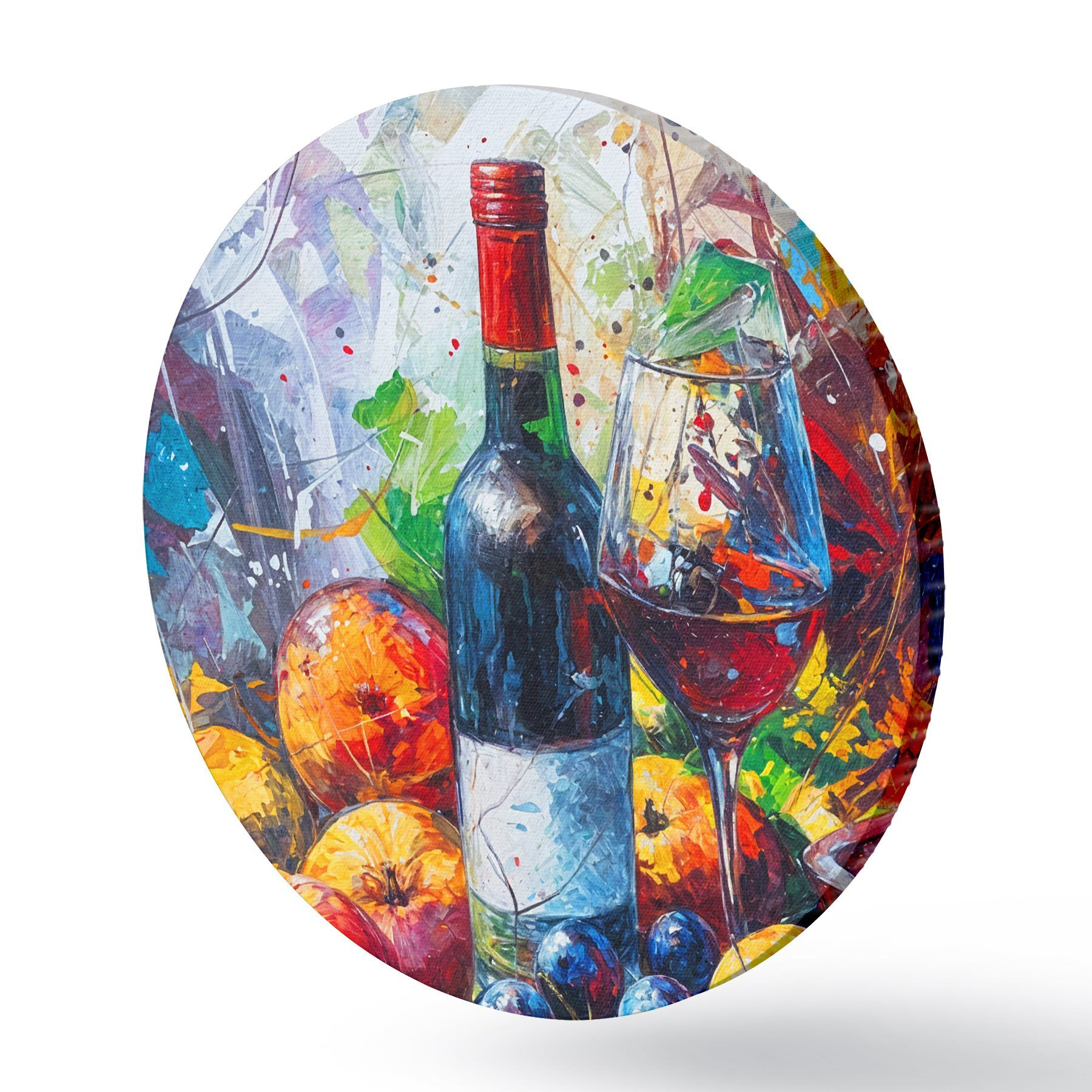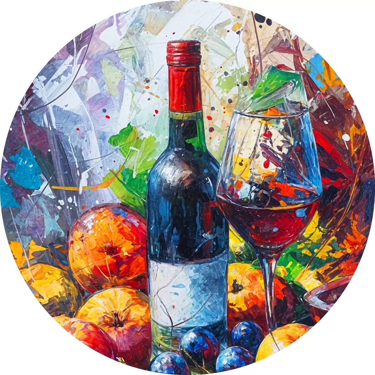 Quadri rotondi Dipinto astratto di natura morta di una bottiglia di vino, un bicchiere di vino e frutti colorati con schizzi di vari colori r38958