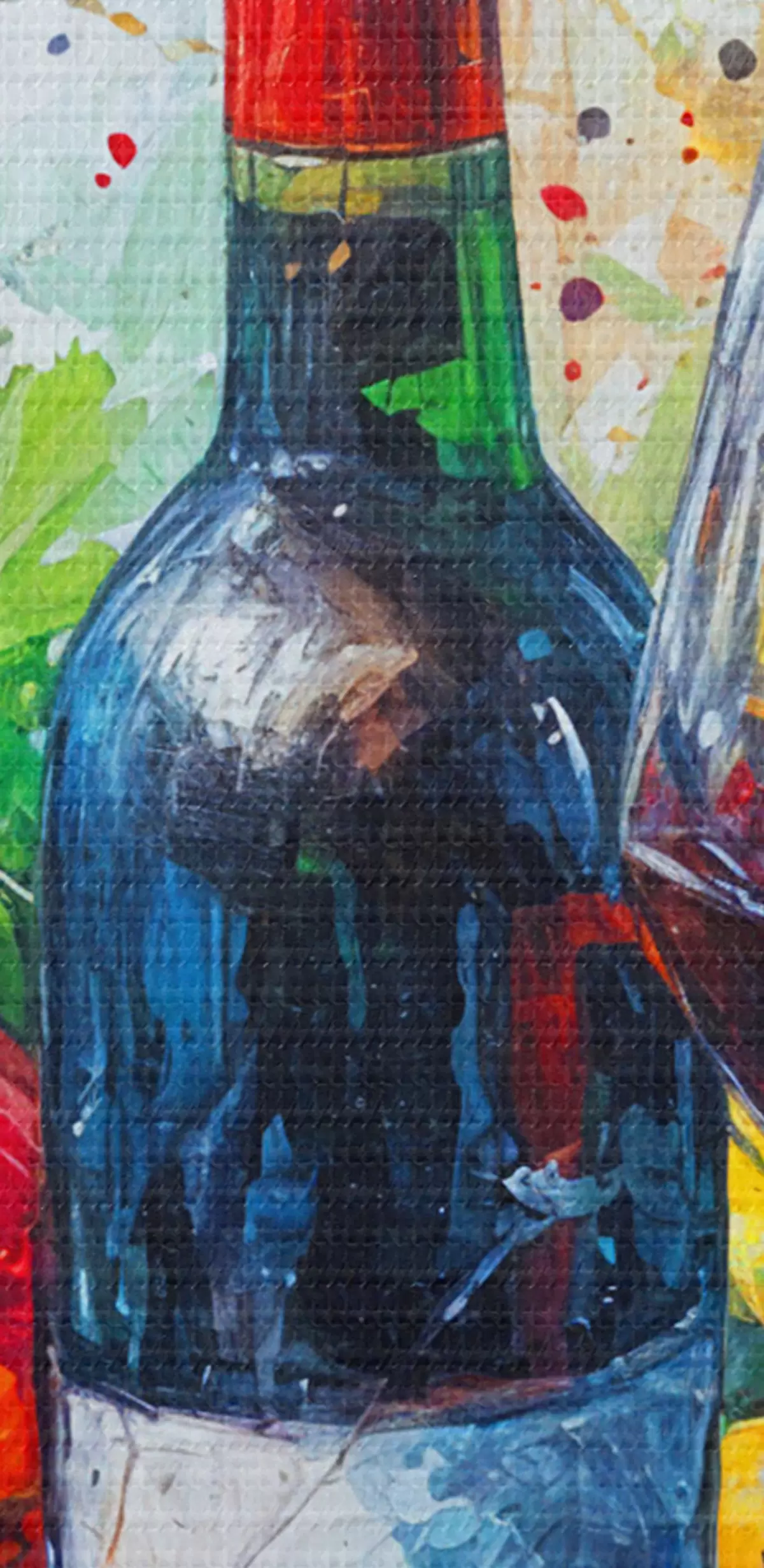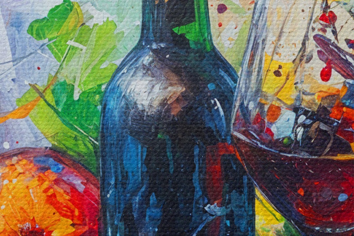 Immagine Dipinto astratto di natura morta di una bottiglia di vino, un bicchiere di vino e frutti colorati con schizzi di vari colori Nr r38958