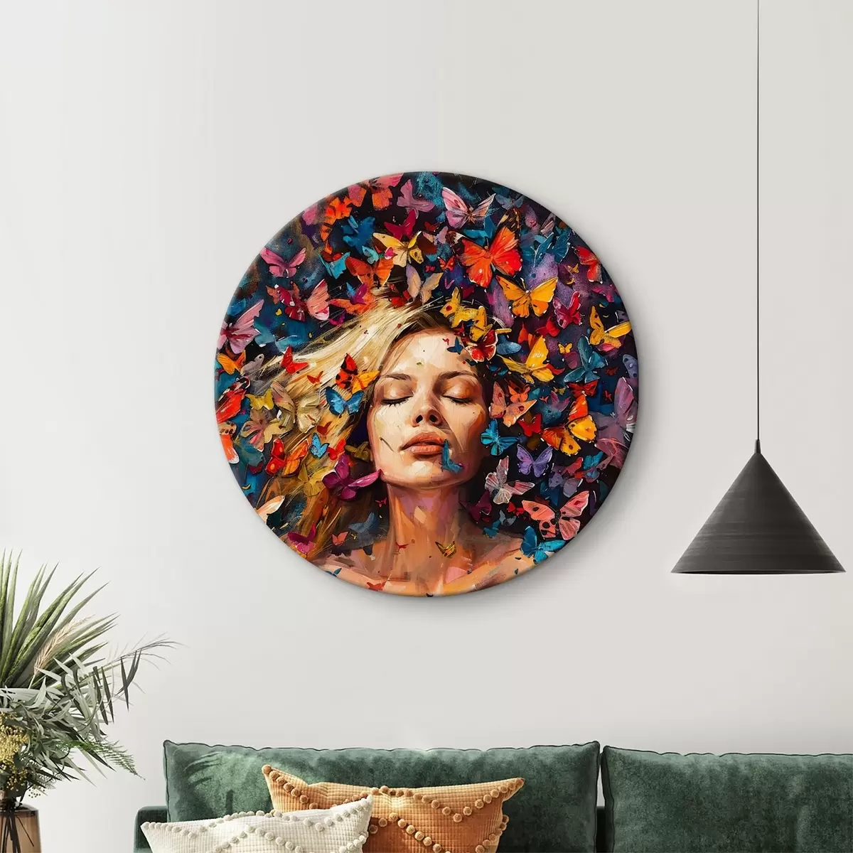 Quadri rotondi Dipinto ad olio raffigurante una giovane donna circondata da uno sciame di farfalle colorate su uno sfondo scuro r38972
