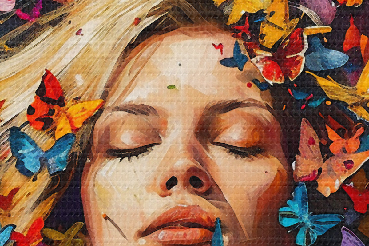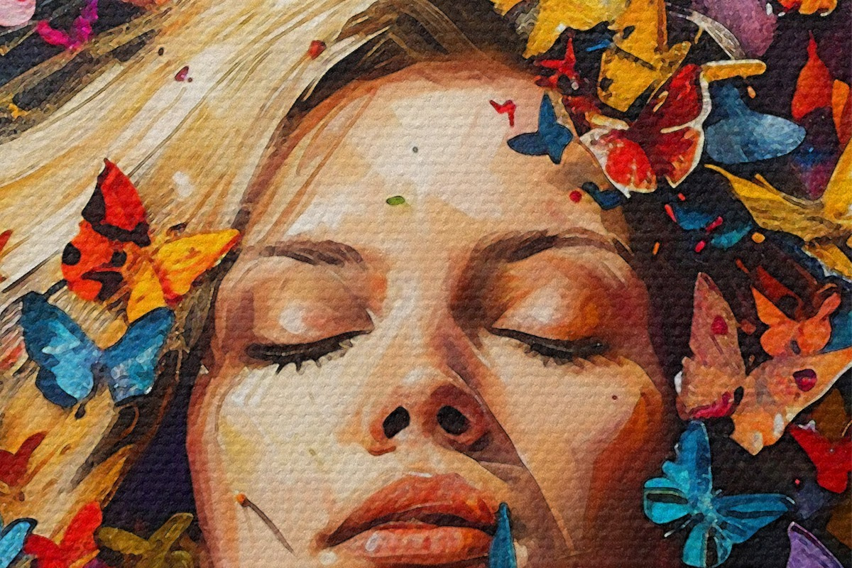 Immagine Dipinto ad olio raffigurante una giovane donna circondata da uno sciame di farfalle colorate su uno sfondo scuro Nr r38972