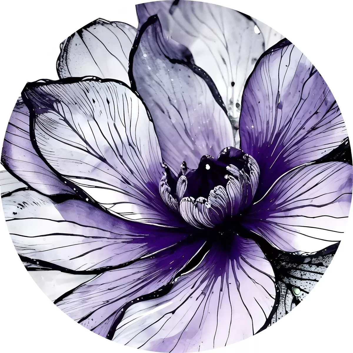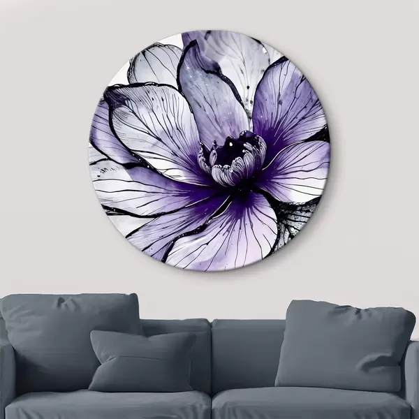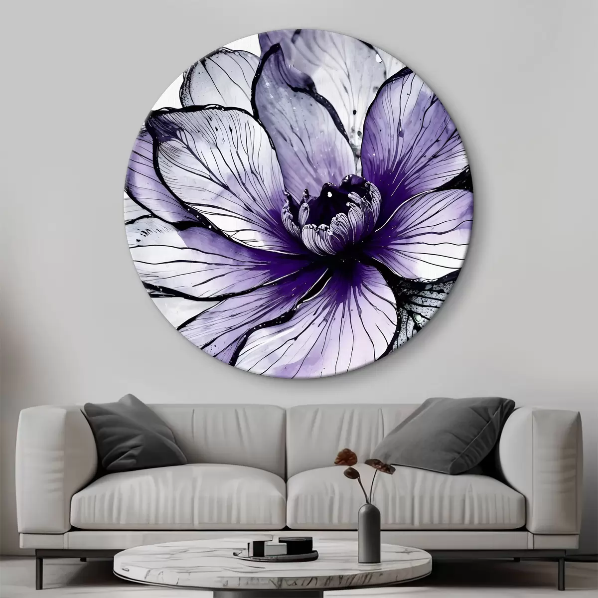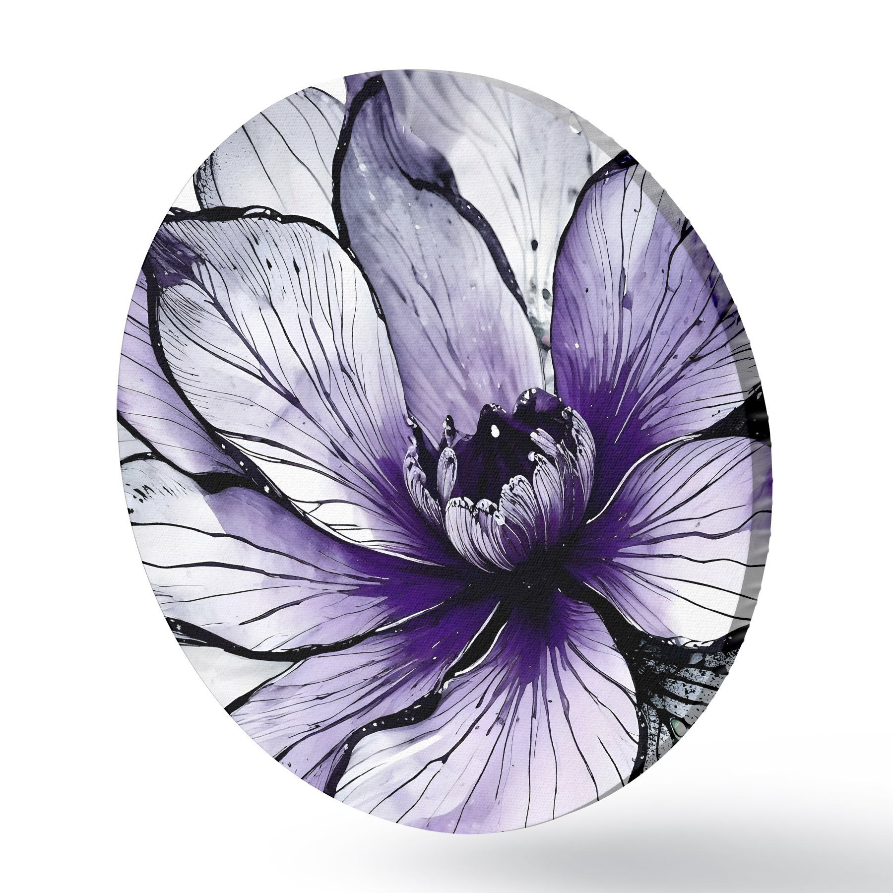 Quadri rotondi Un grande fiore viola vibrante con petali delicati e intricati su uno sfondo scuro r38982