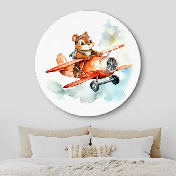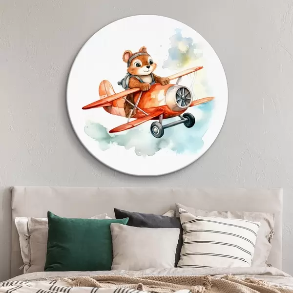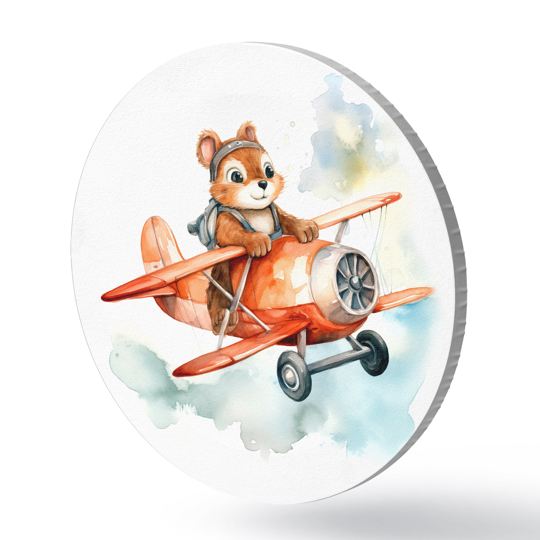Quadri rotondi Lo scoiattolo del bambino vola in un acquerello dell'illustrazione dei bambini dell'aereo rosso r39116