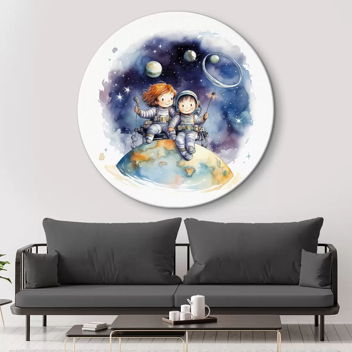 Quadri rotondi Bambini in tute spaziali seduti su un pianeta nello spazio illustrazione ad acquerello per bambini r39117