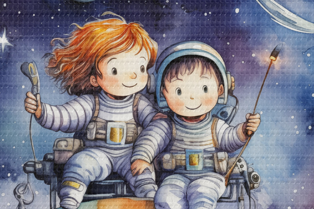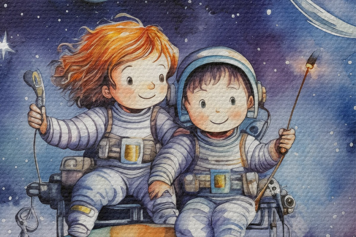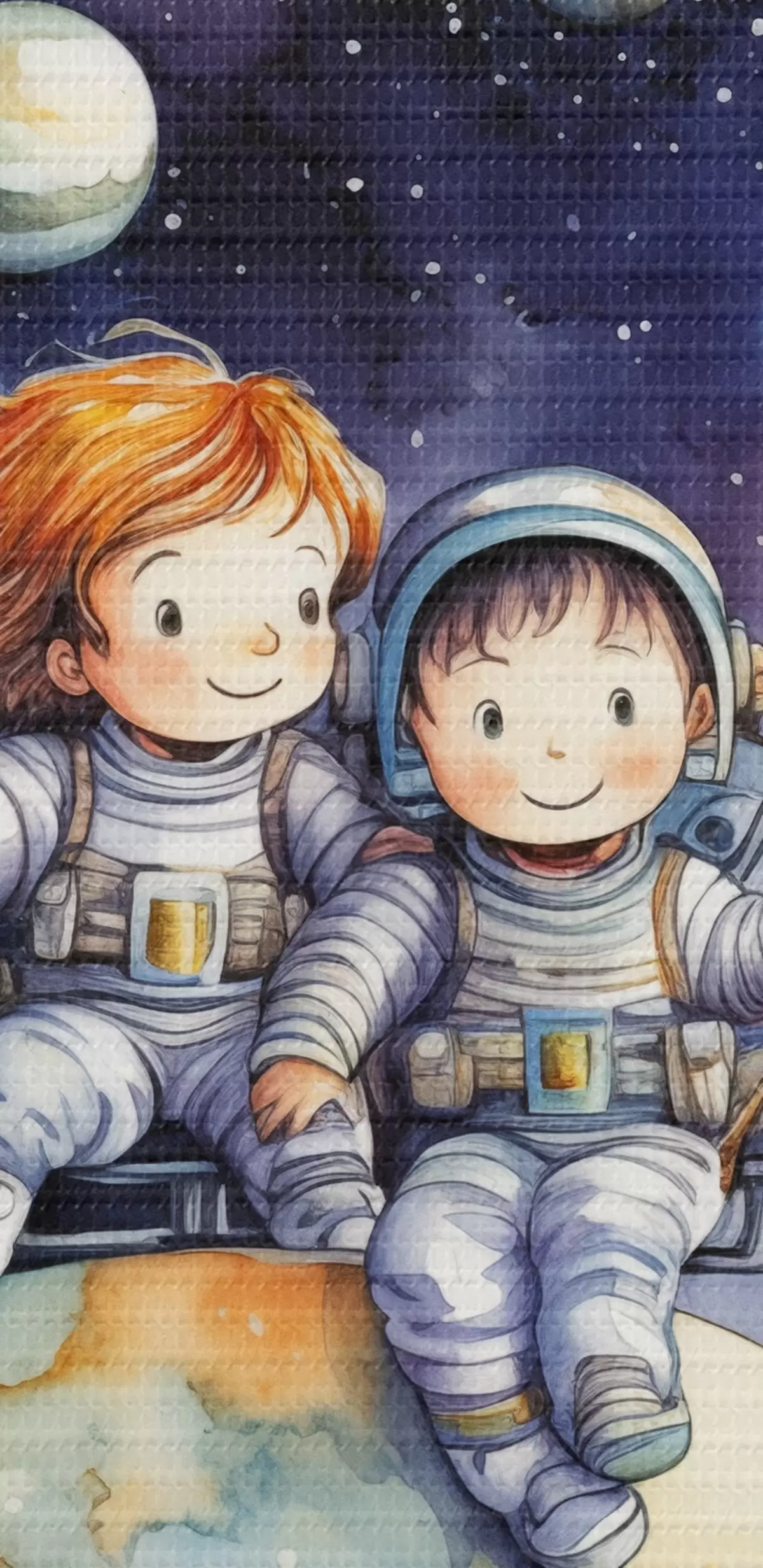 Immagine Bambini in tute spaziali seduti su un pianeta nello spazio illustrazione ad acquerello per bambini Nr r39117