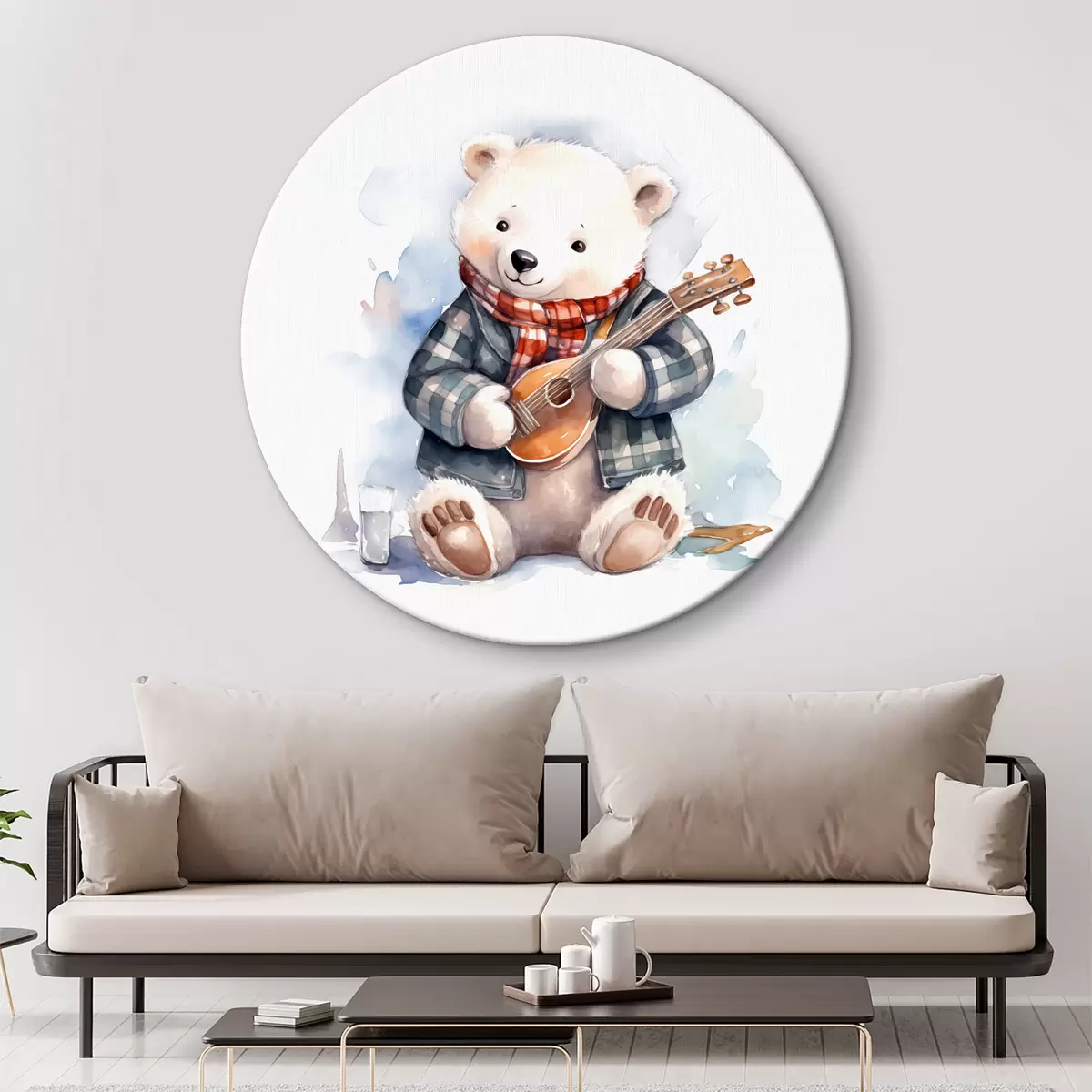 Quadri rotondi Il musicista dell'orso polare in un vestito a quadretti blu e una sciarpa rossa suona l'illustrazione dell'acquerello dei bambini della chitarra r39120