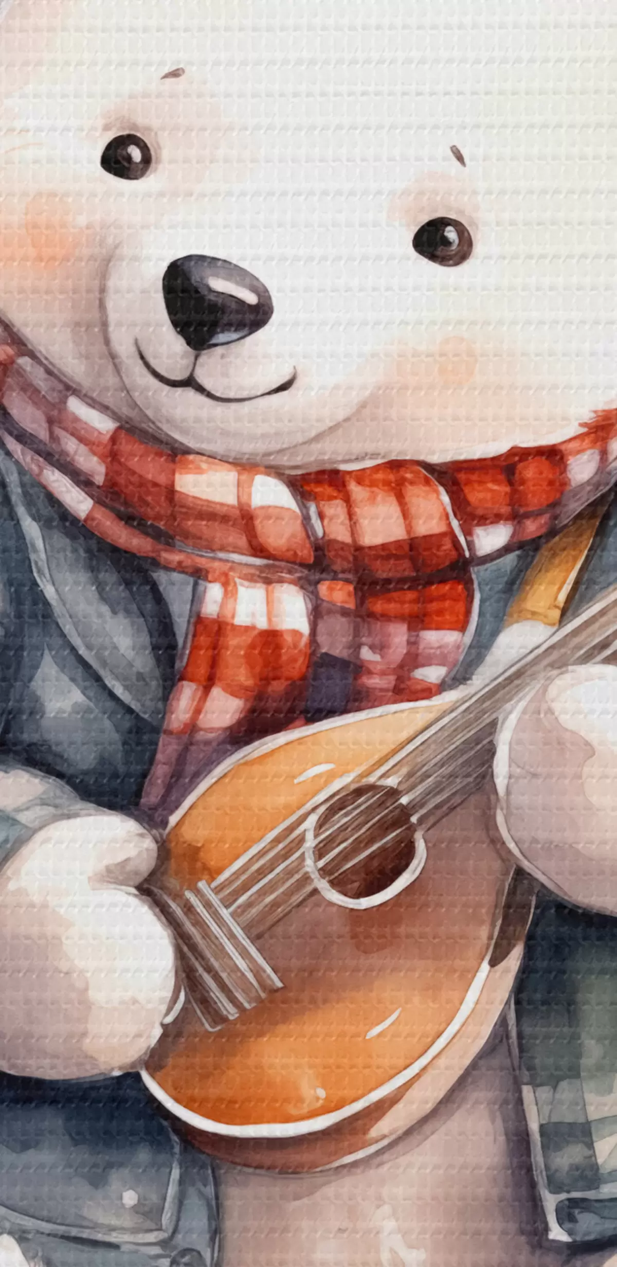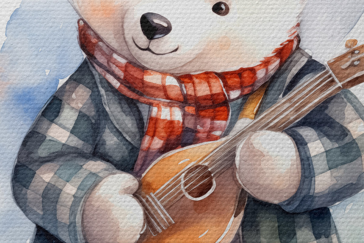 Immagine Il musicista dell'orso polare in un vestito a quadretti blu e una sciarpa rossa suona l'illustrazione dell'acquerello dei bambini della chitarra Nr r39120