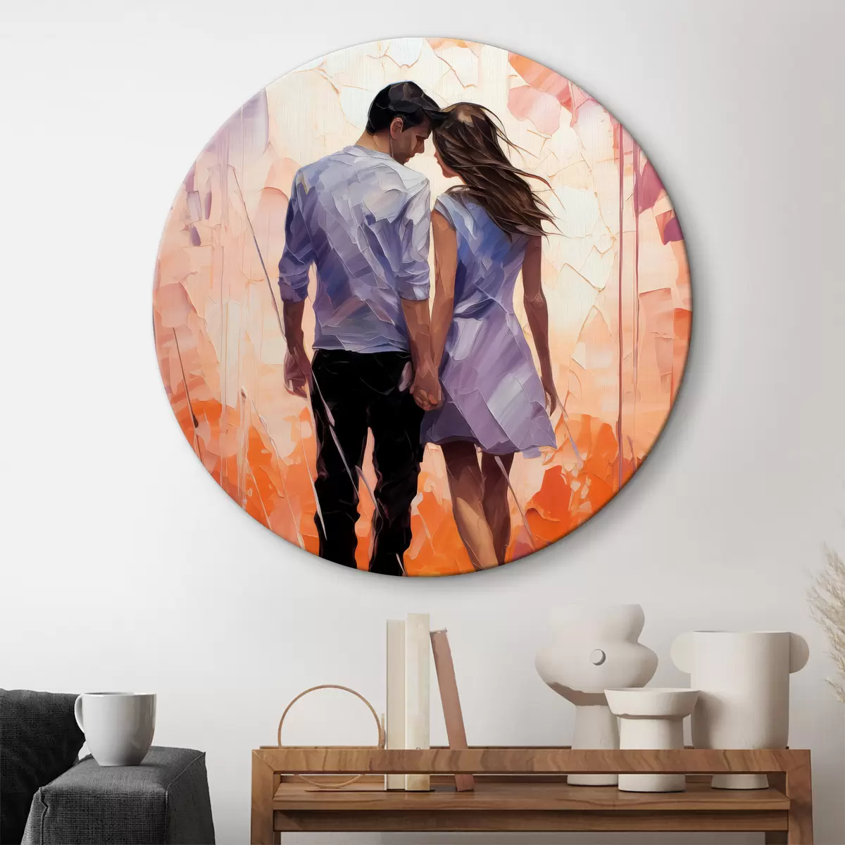 Quadri rotondi Silhouette di una coppia innamorata pittura astratta, ragazza e ragazzo, colore rosa, arancione, viola, nero r39124