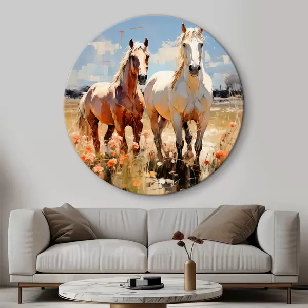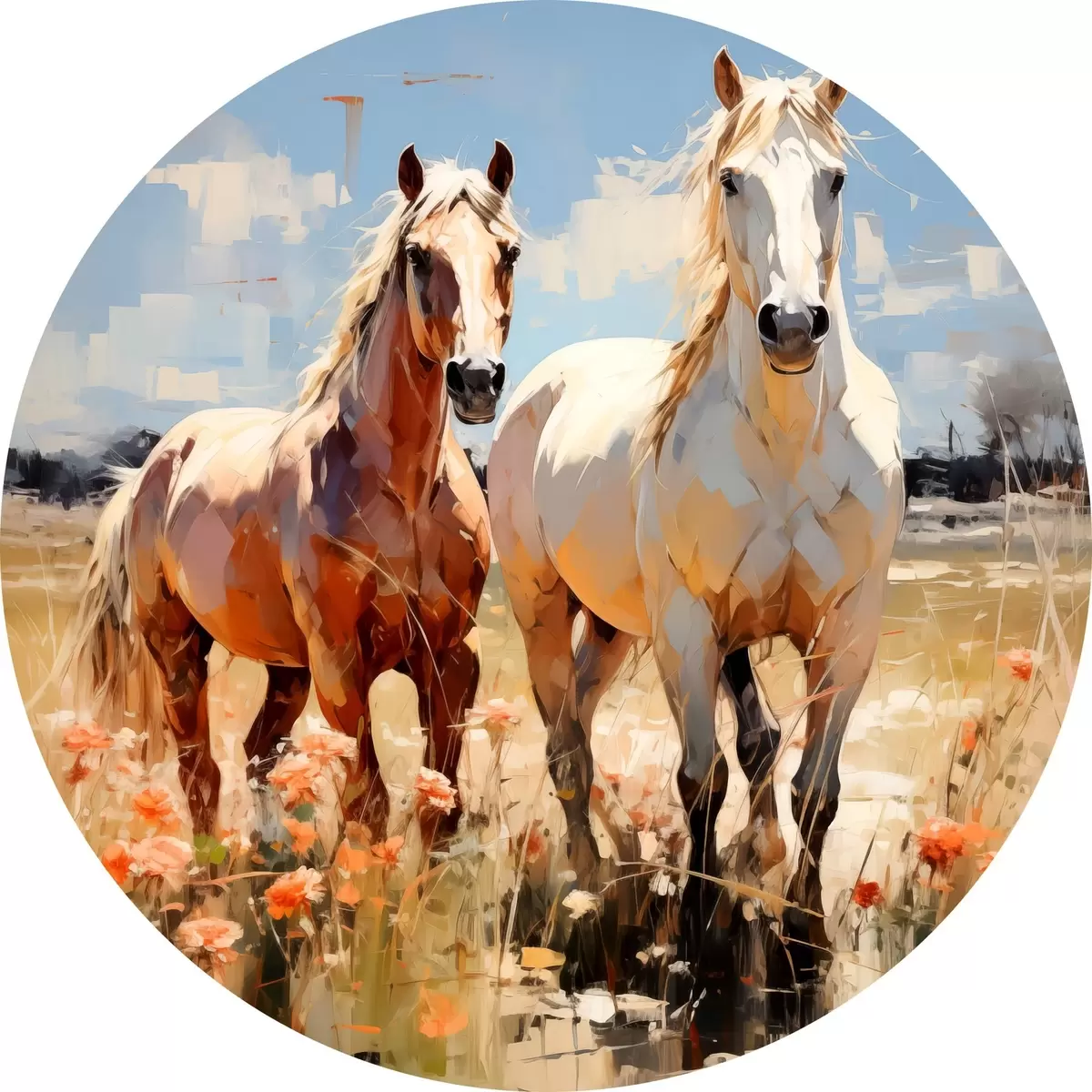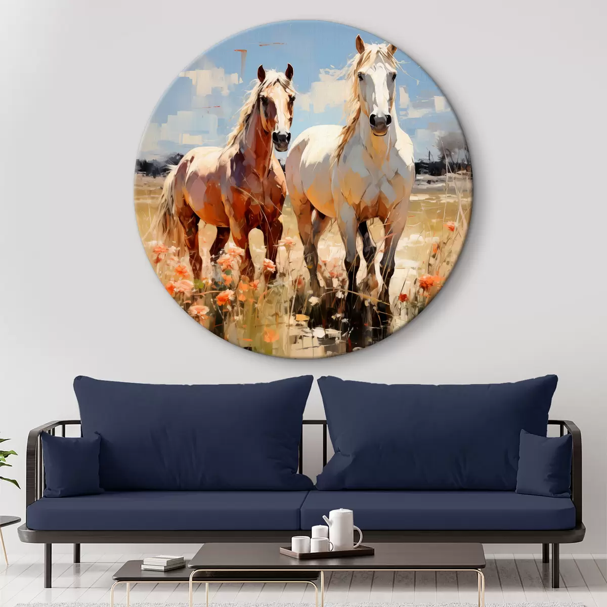 Quadri rotondi Cavalli bianchi e marroni pascolano in un prato tra fiori di campo pittura ad olio arte astratta r39187