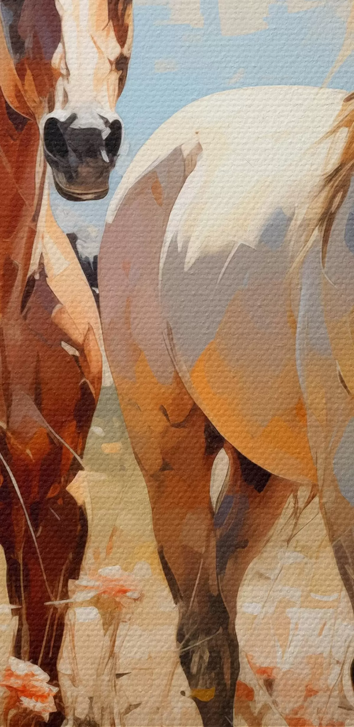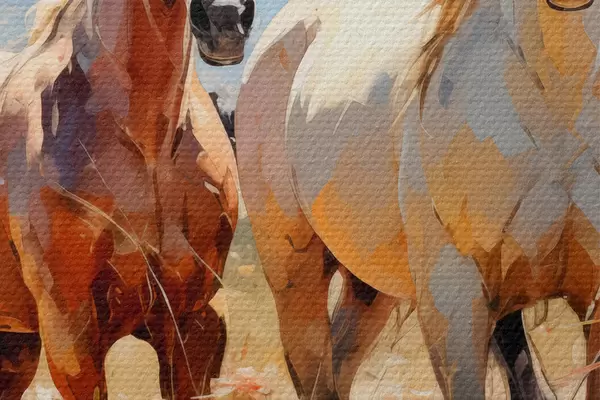 Immagine Cavalli bianchi e marroni pascolano in un prato tra fiori di campo pittura ad olio arte astratta Nr r39187