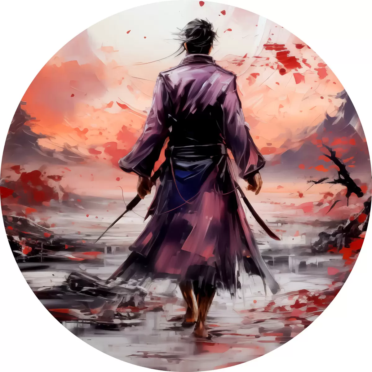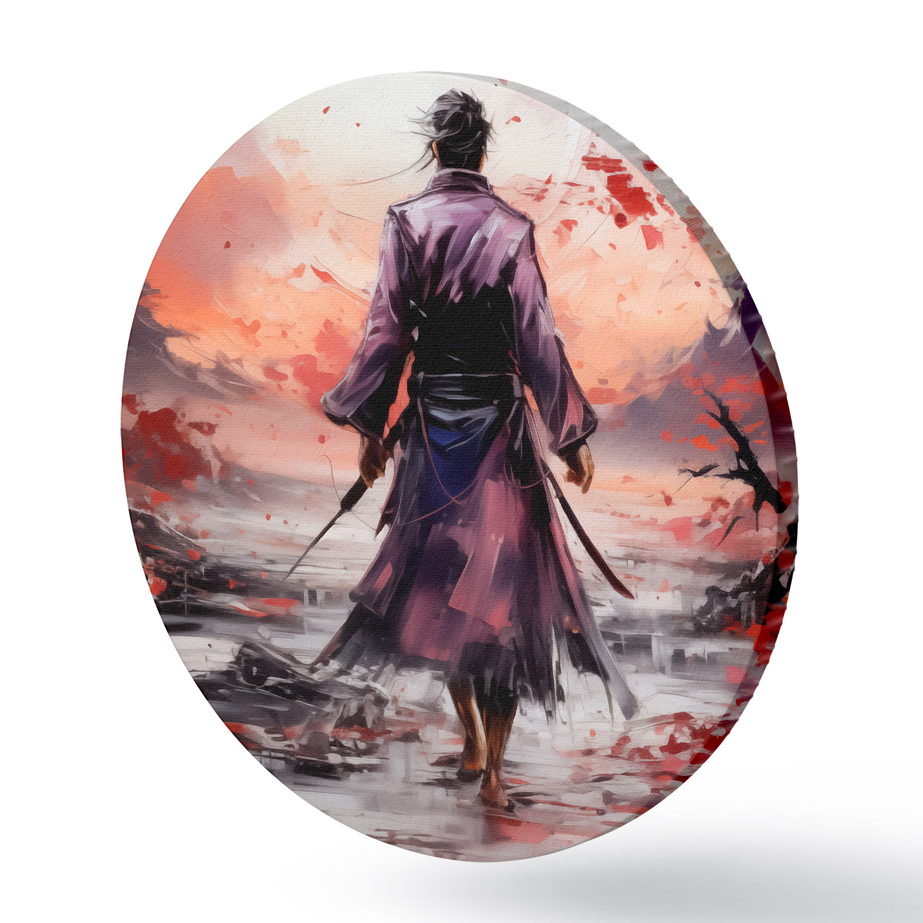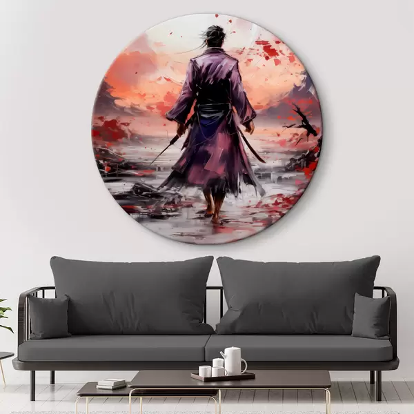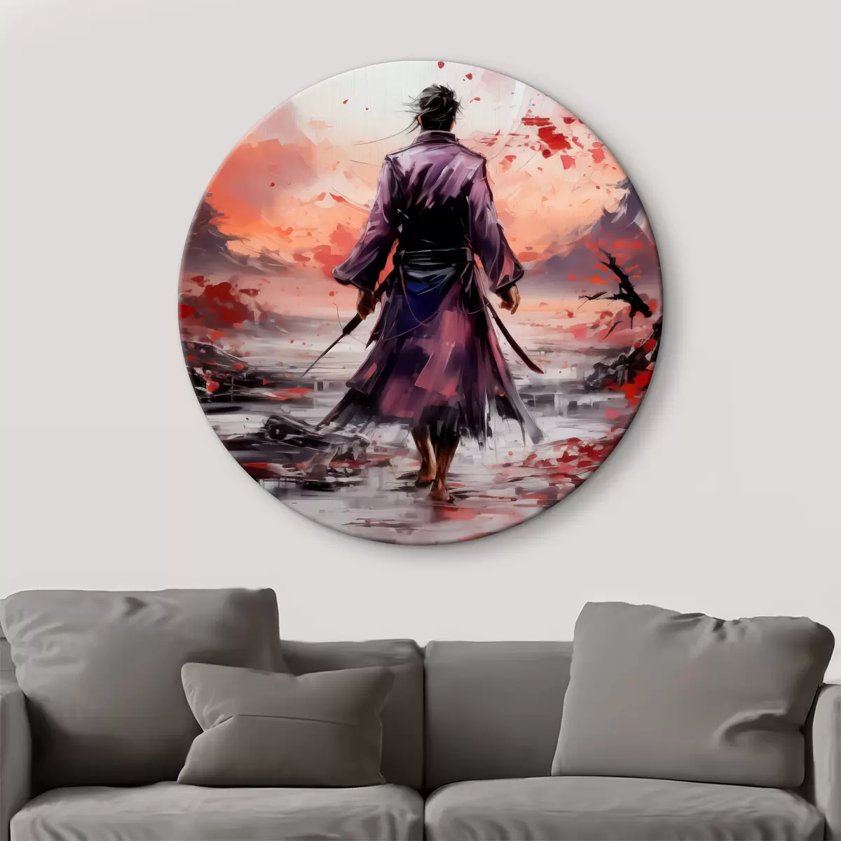 Quadri rotondi Un samurai con una spada in un mantello viola cammina verso le montagne dipingendo arte astratta r39194