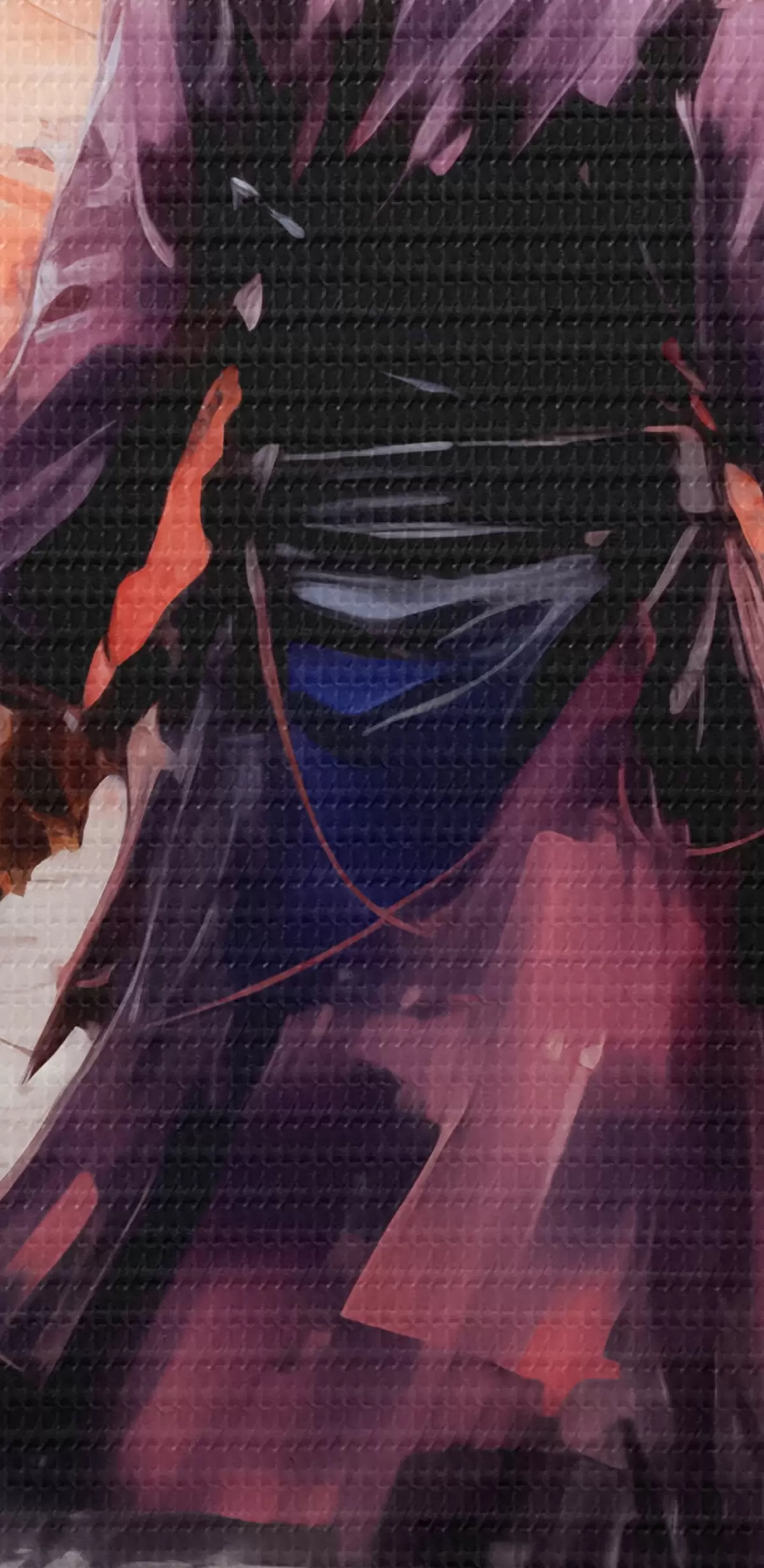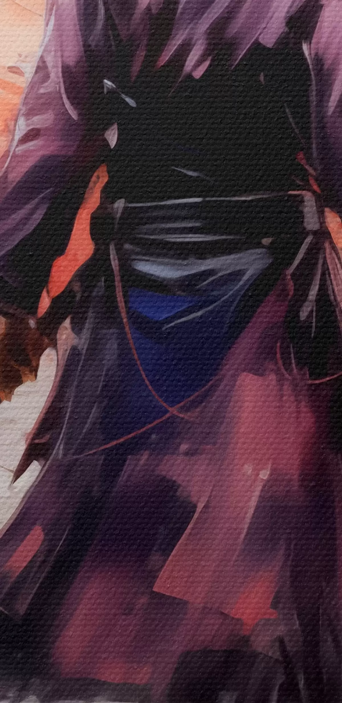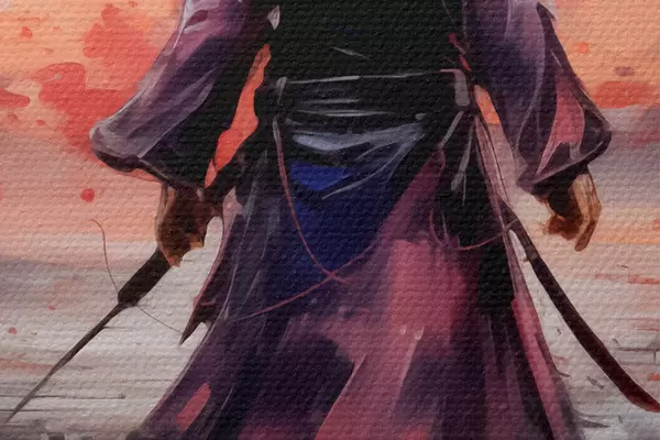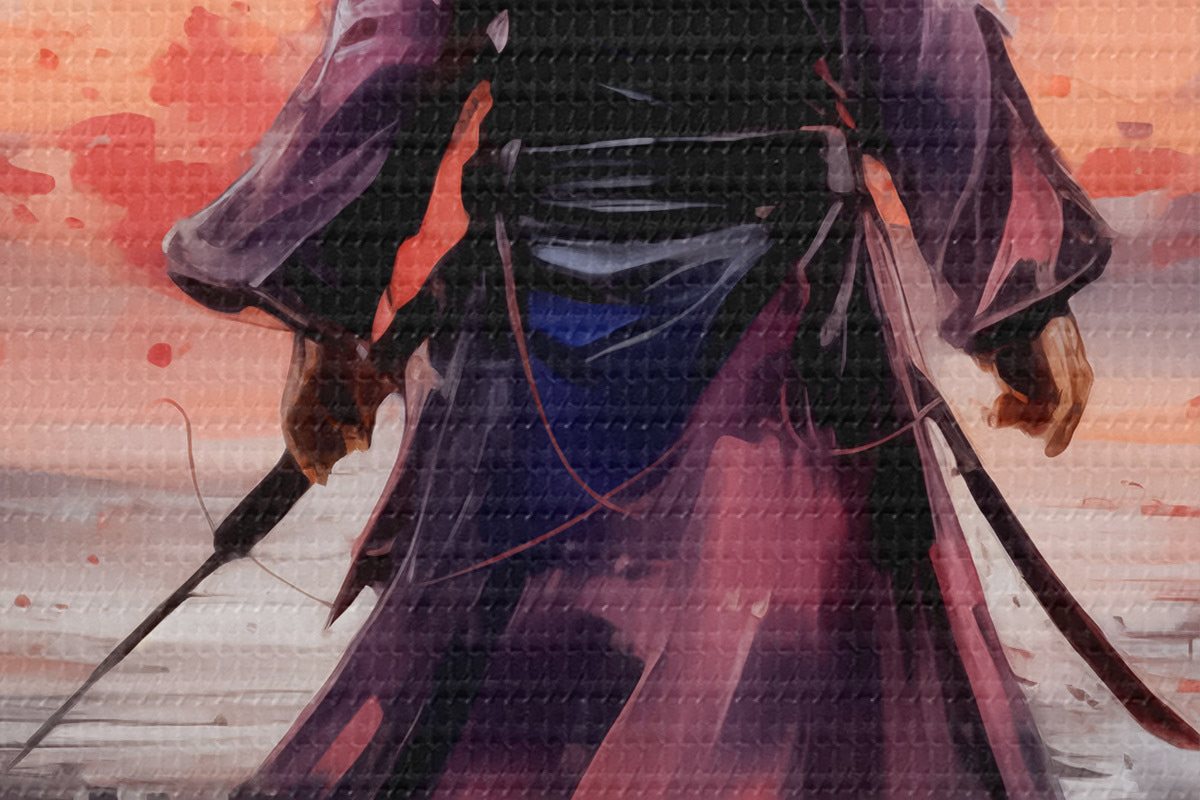 Immagine Un samurai con una spada in un mantello viola cammina verso le montagne dipingendo arte astratta Nr r39194