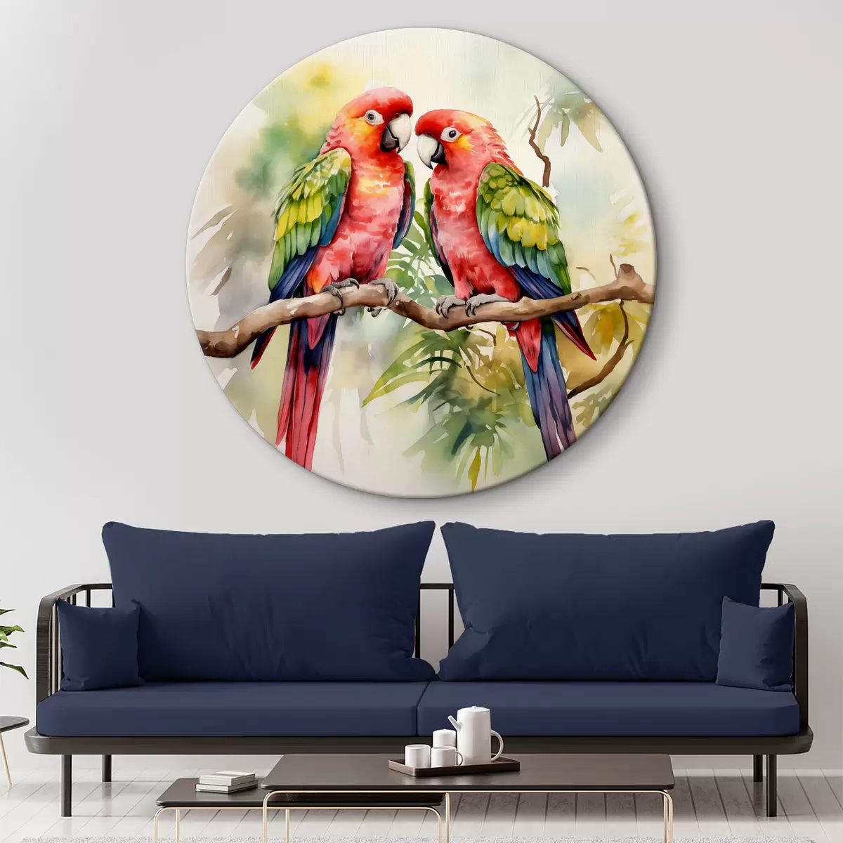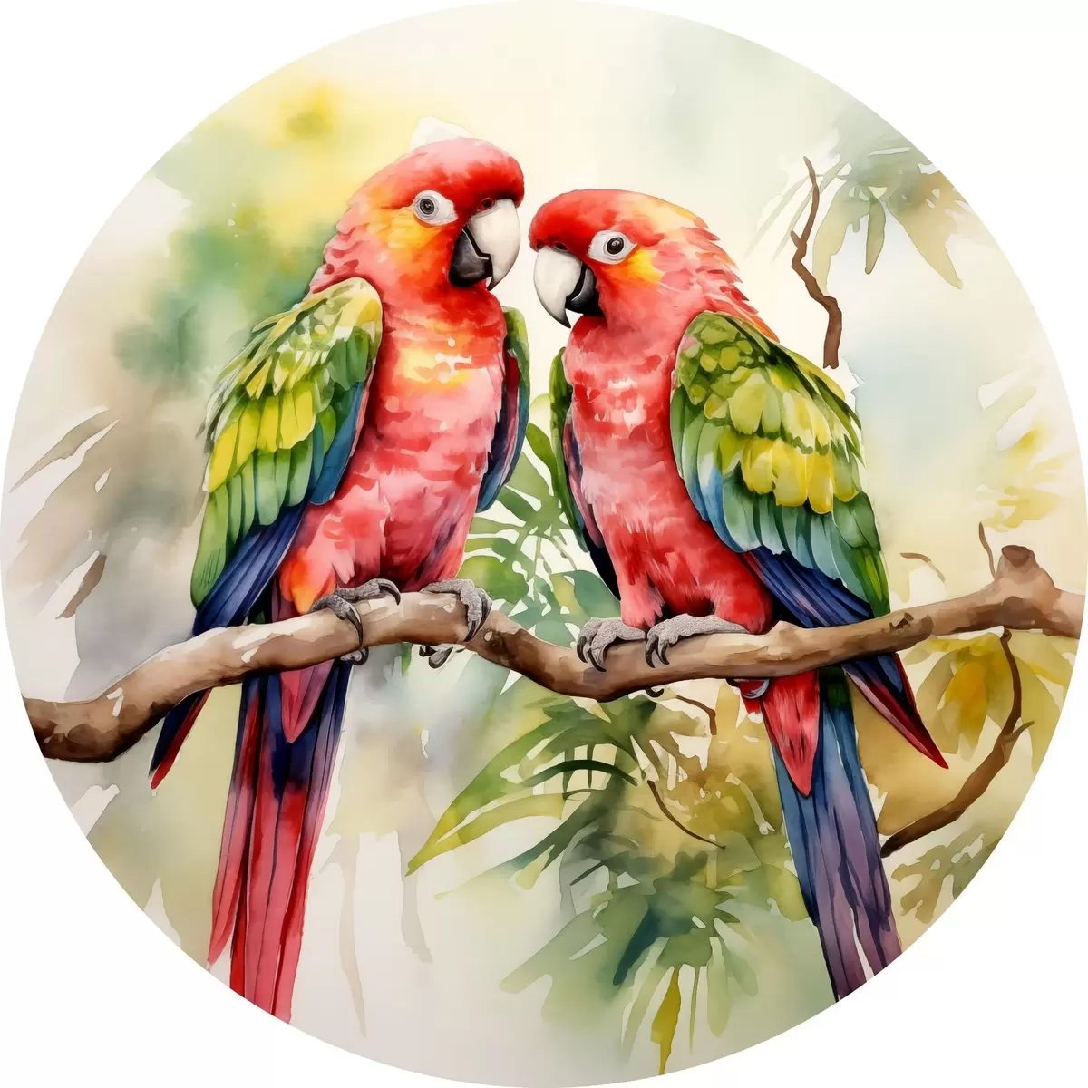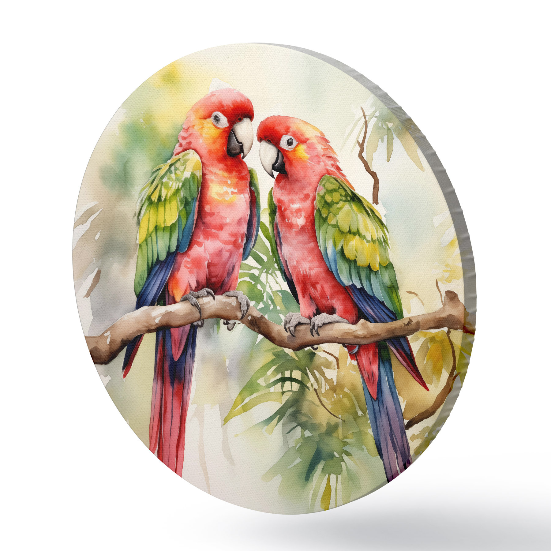 Quadri rotondi Due pappagalli Ara luminosi seduti su un ramo acquerello r39333
