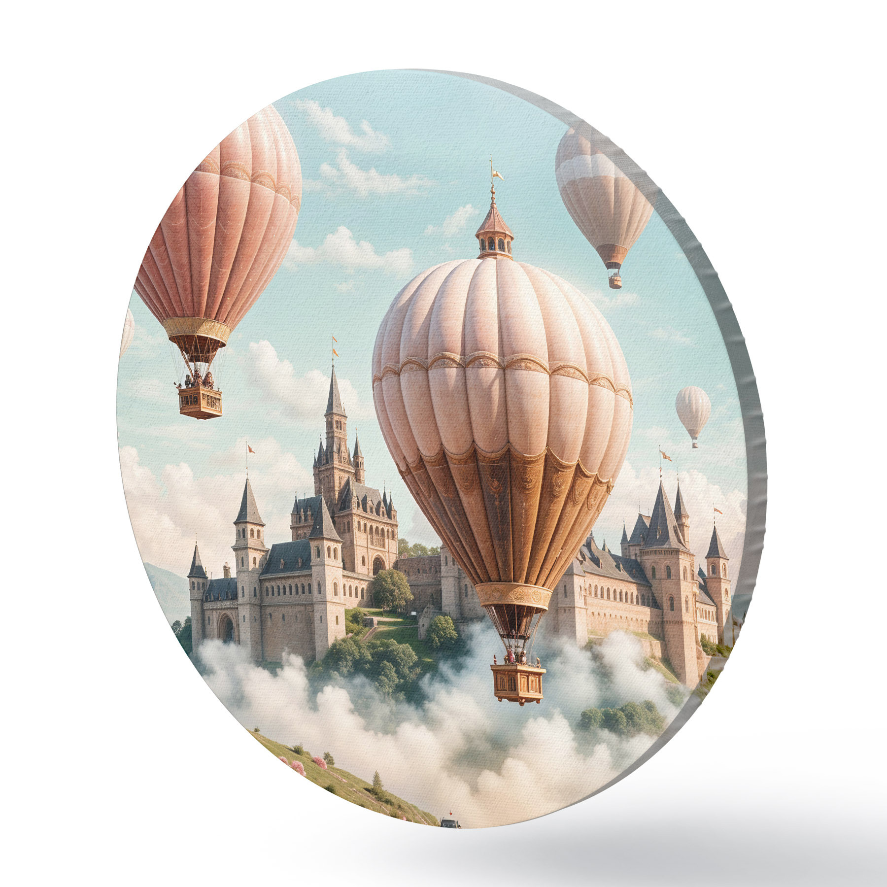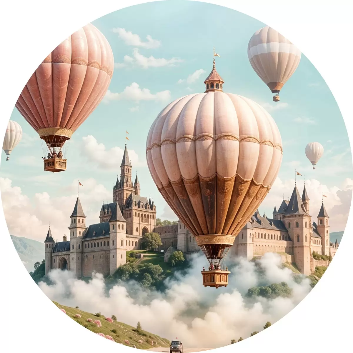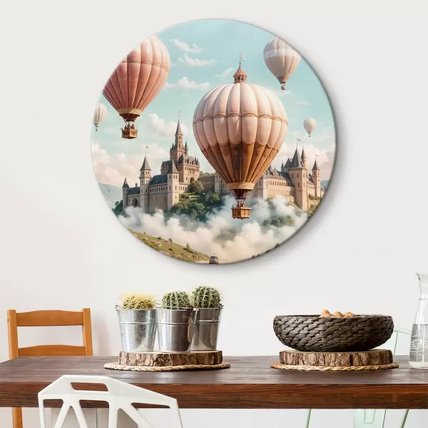 Quadri rotondi Un castello fantastico circondato da mongolfiere rosa che fluttuano in un cielo nuvoloso sopra un paesaggio verde e lussureggiante r39387