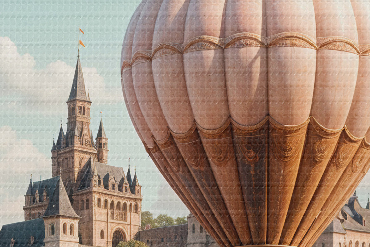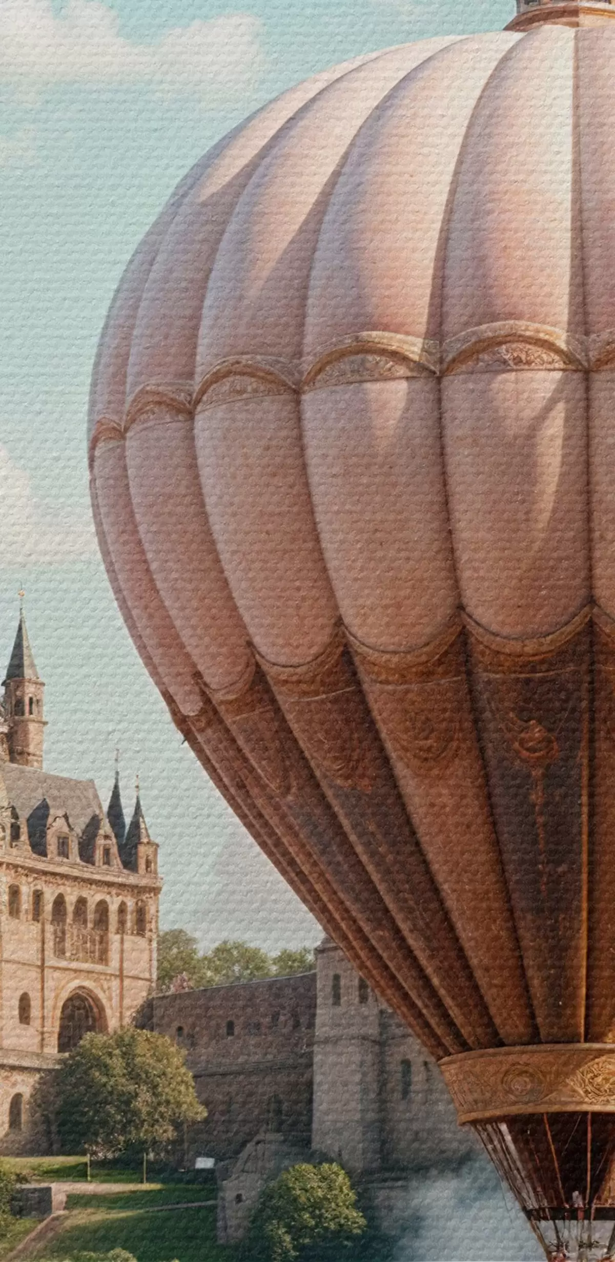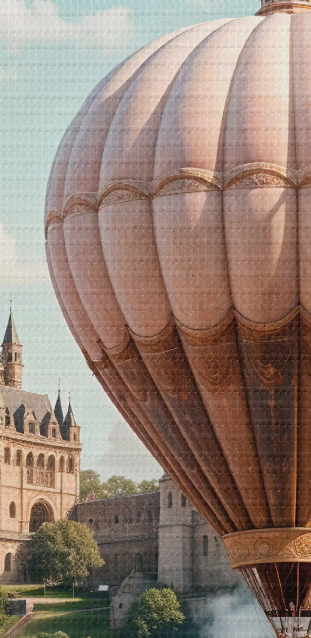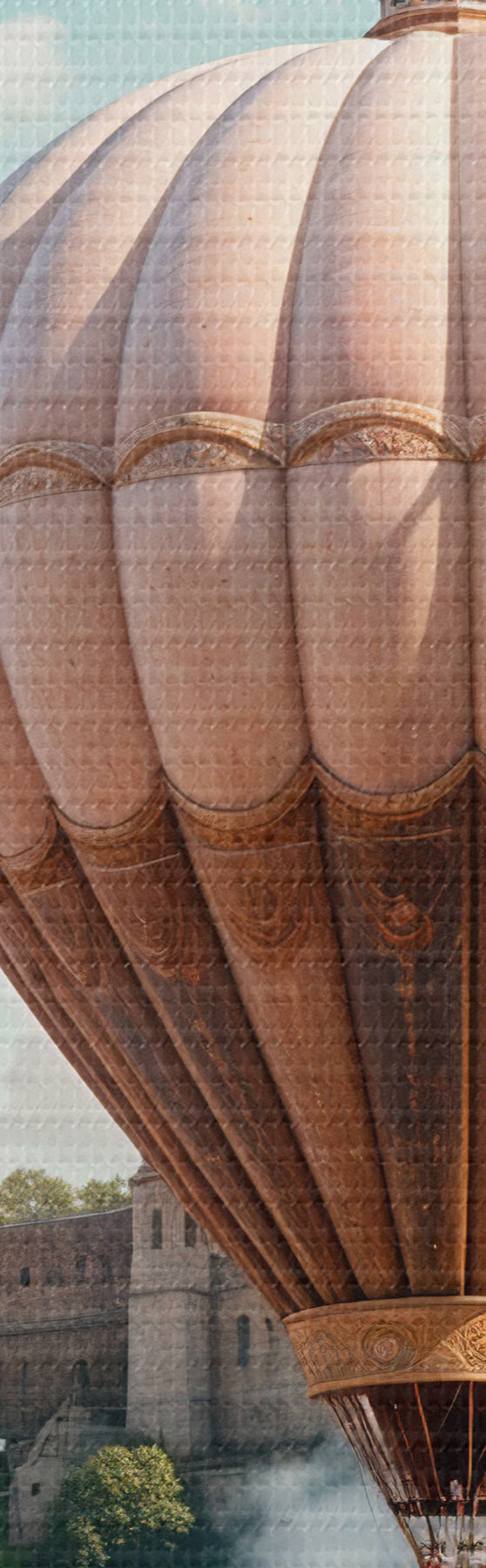 Immagine Un castello fantastico circondato da mongolfiere rosa che fluttuano in un cielo nuvoloso sopra un paesaggio verde e lussureggiante Nr r39387