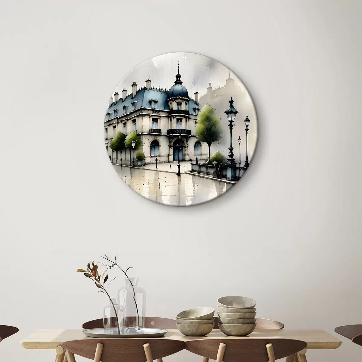 Quadri rotondi Un grande edificio ad acquerello circondato da lampioni e alberi, in una giornata piovosa r39391