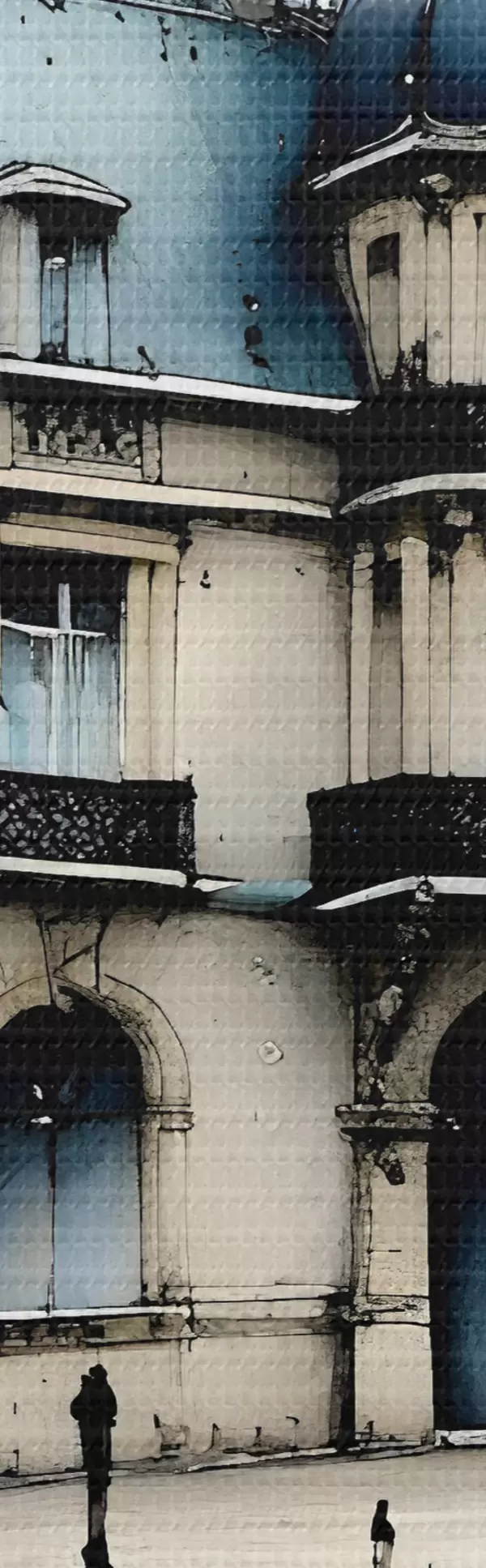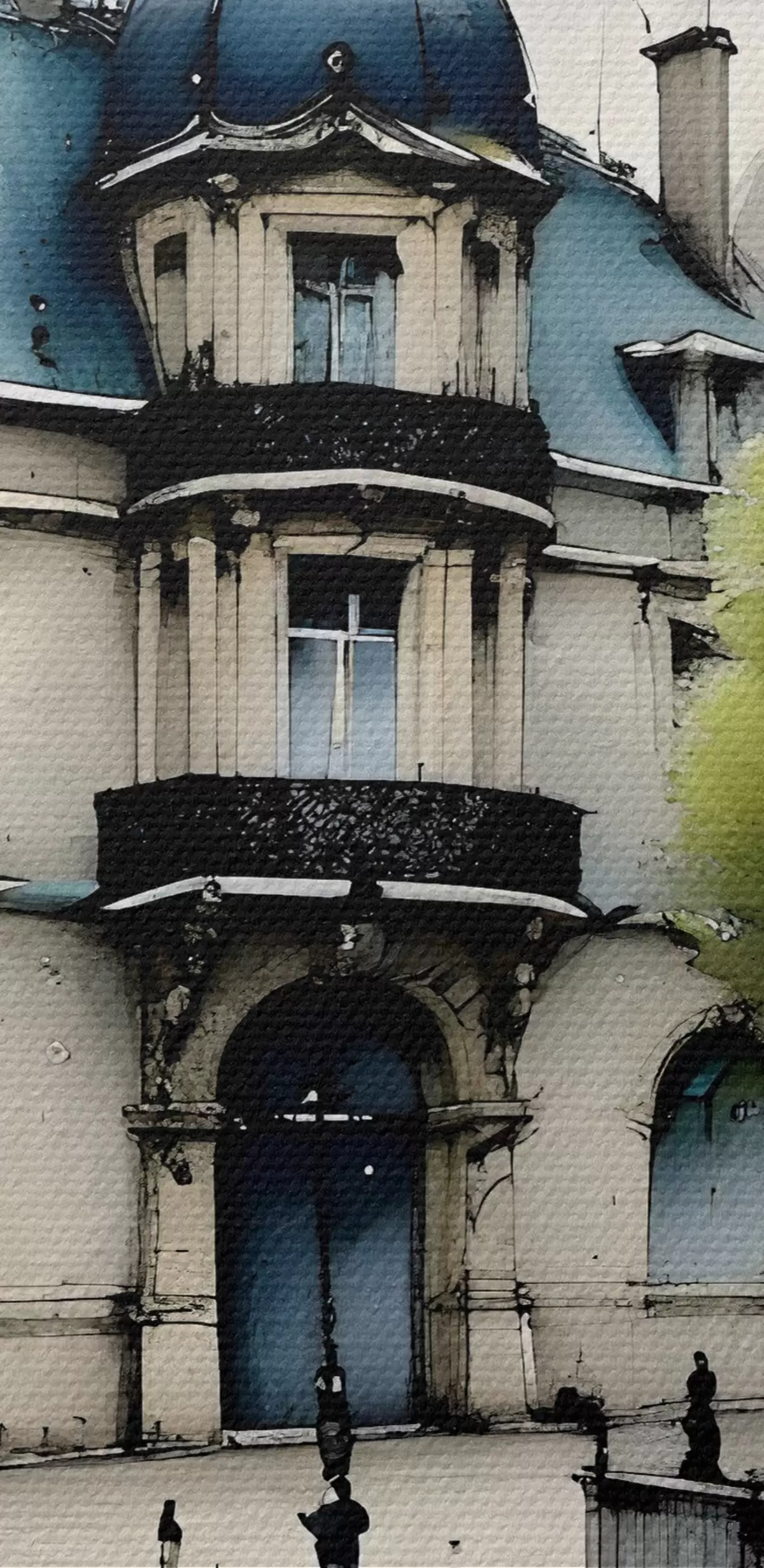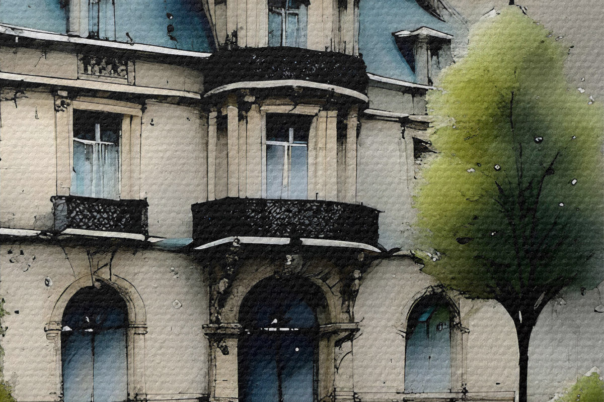 Immagine Un grande edificio ad acquerello circondato da lampioni e alberi, in una giornata piovosa Nr r39391