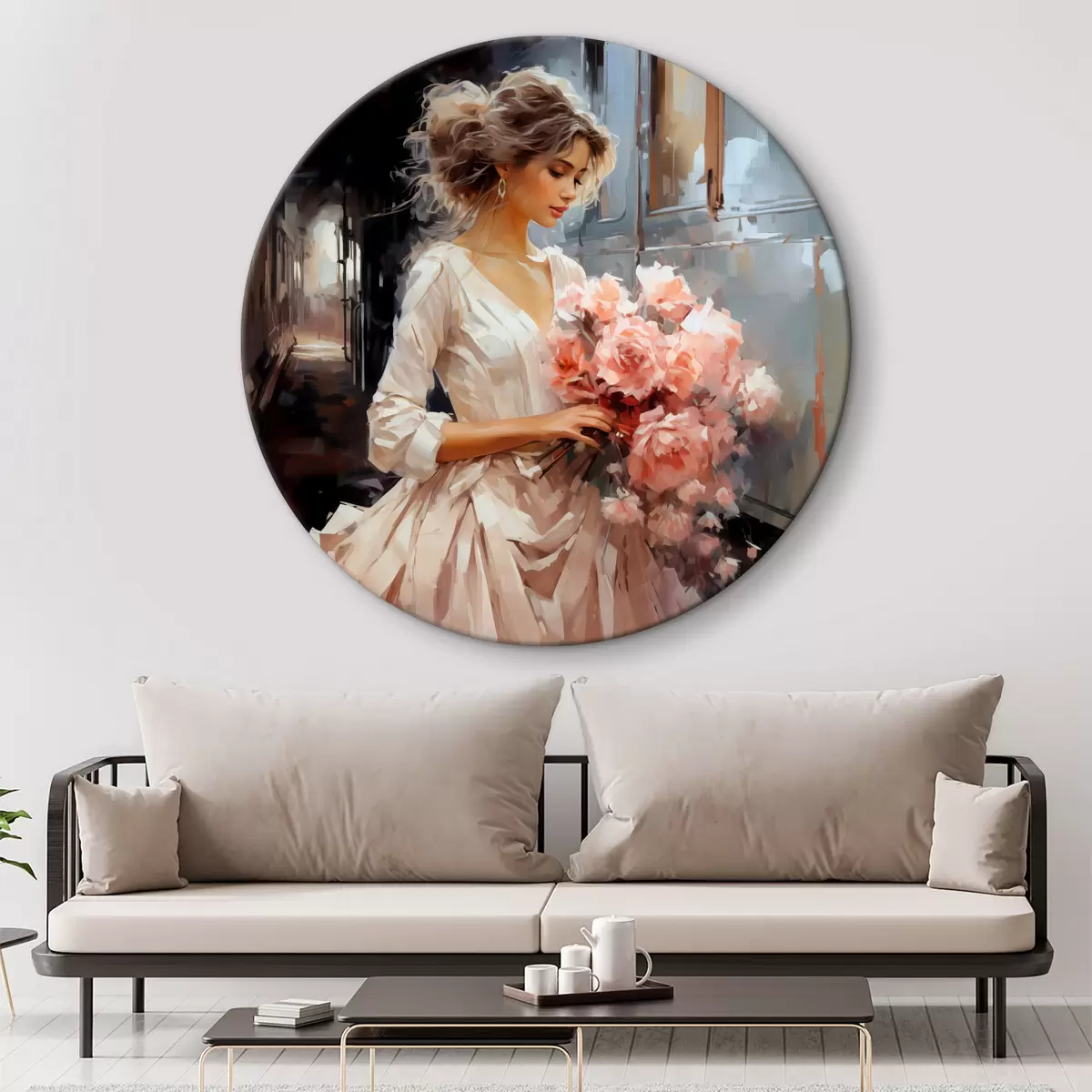 Quadri rotondi Una ragazza in abito bianco alla stazione tiene in mano un mazzo di rose rosa, dipinto ad olio r39438