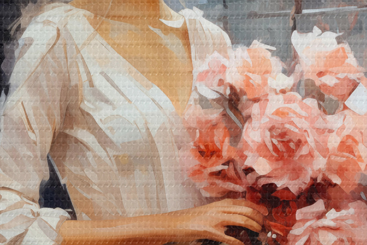Immagine Una ragazza in abito bianco alla stazione tiene in mano un mazzo di rose rosa, dipinto ad olio Nr r39438