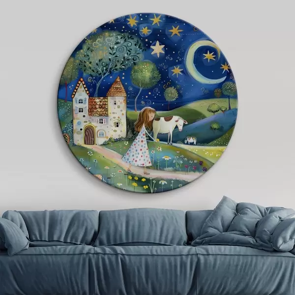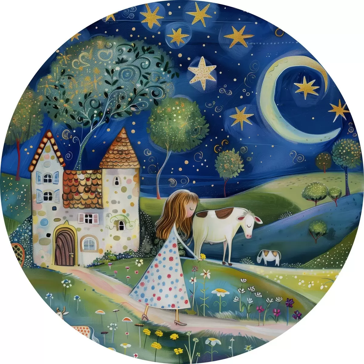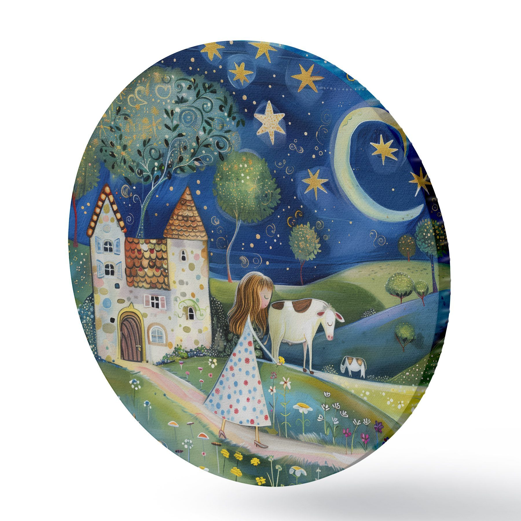 Quadri rotondi Una piccola principessa, un cane, una mucca e una casa fantastica sotto le stelle in un bizzarro stile artistico ingenuo r39451