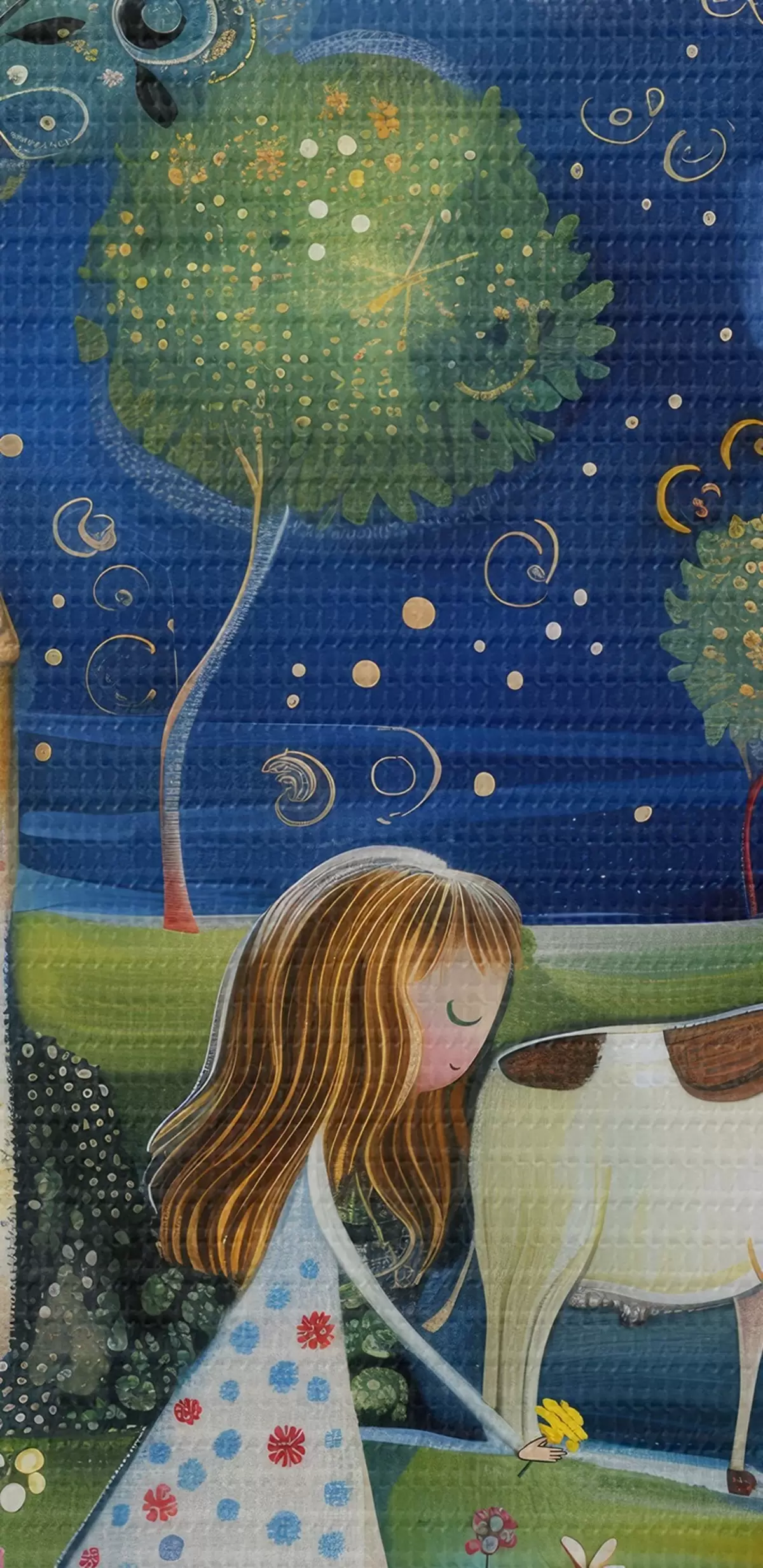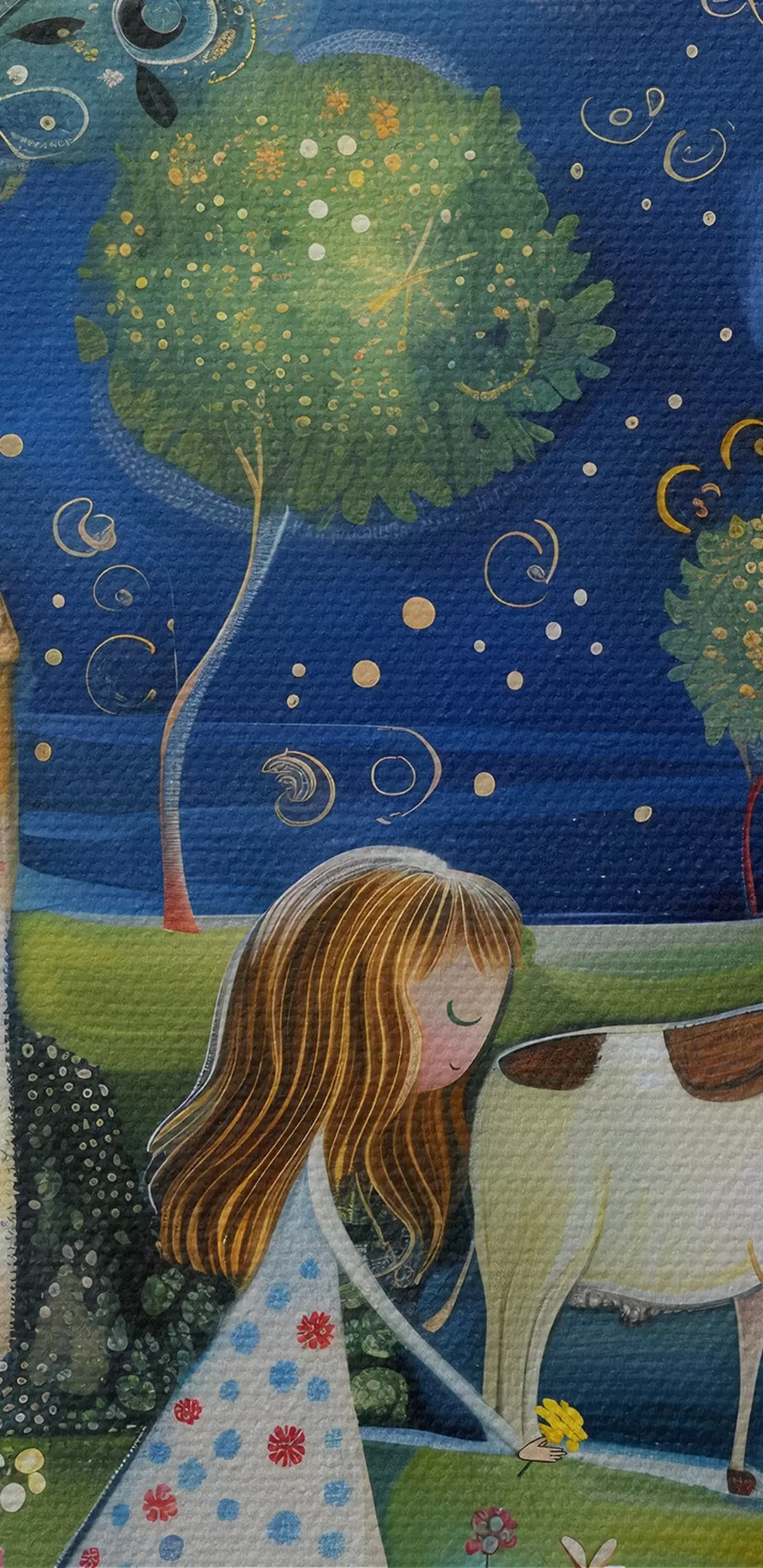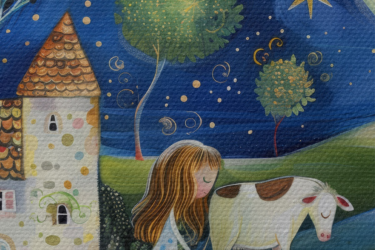 Immagine Una piccola principessa, un cane, una mucca e una casa fantastica sotto le stelle in un bizzarro stile artistico ingenuo Nr r39451