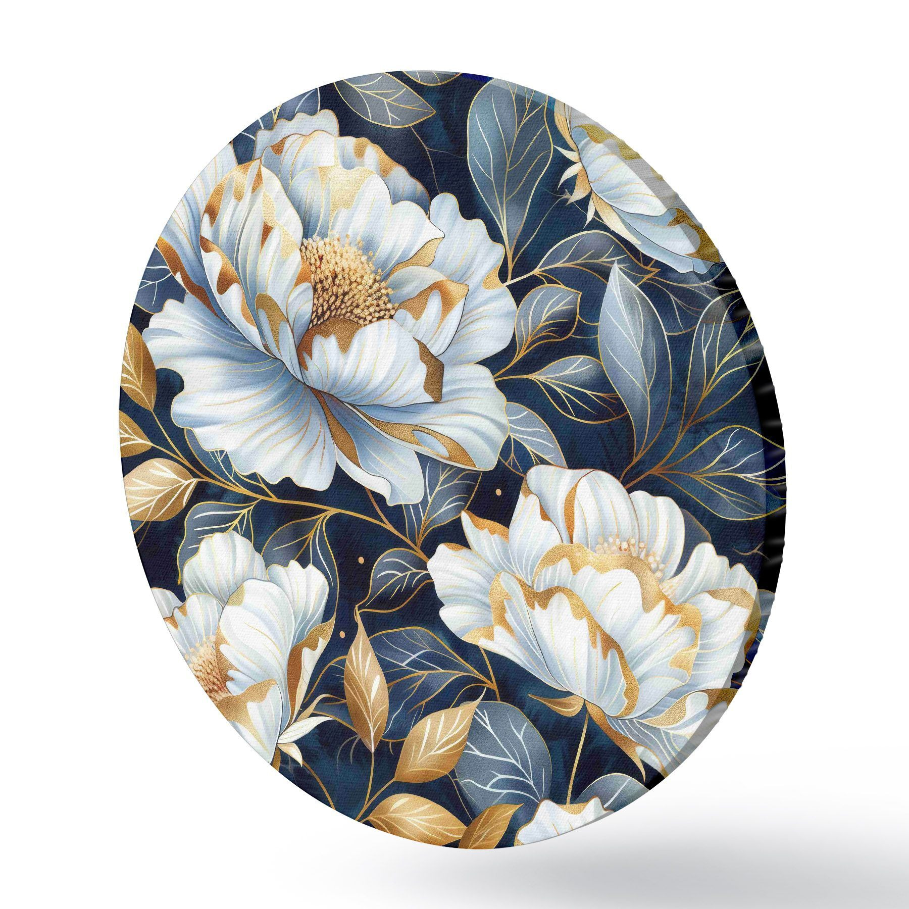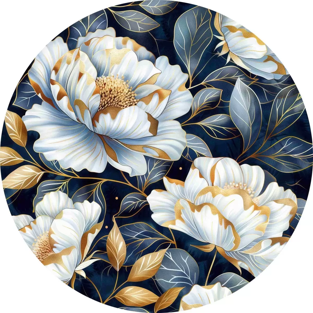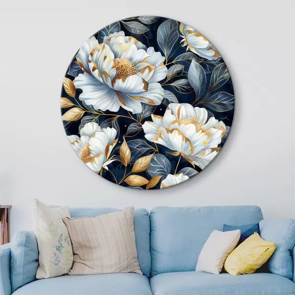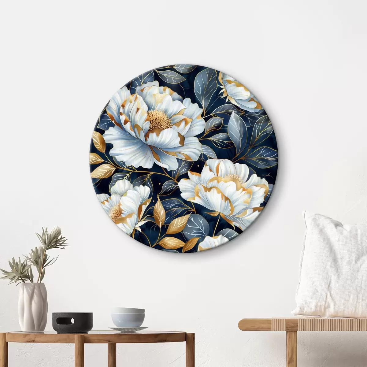 Quadri rotondi Peonie e rose bianche con contorno, foglie blu e motivi floreali sullo sfondo r39457