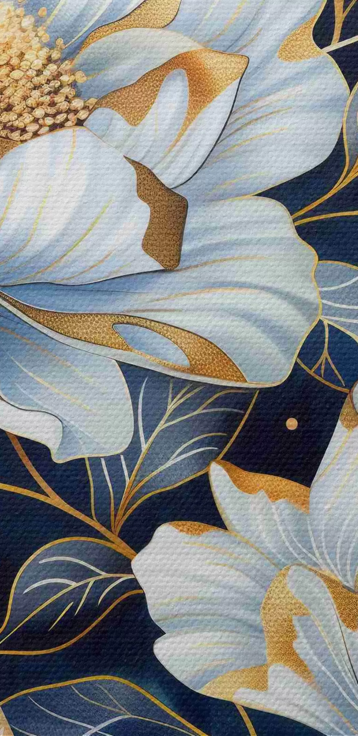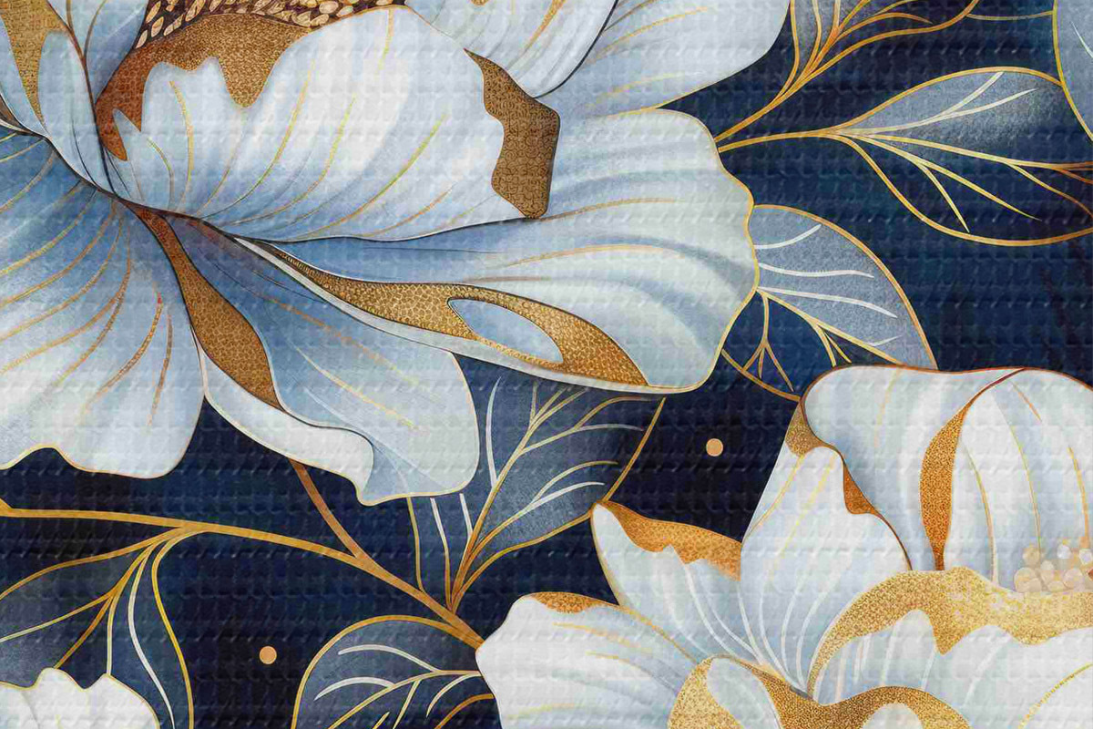 Immagine Peonie e rose bianche con contorno, foglie blu e motivi floreali sullo sfondo Nr r39457