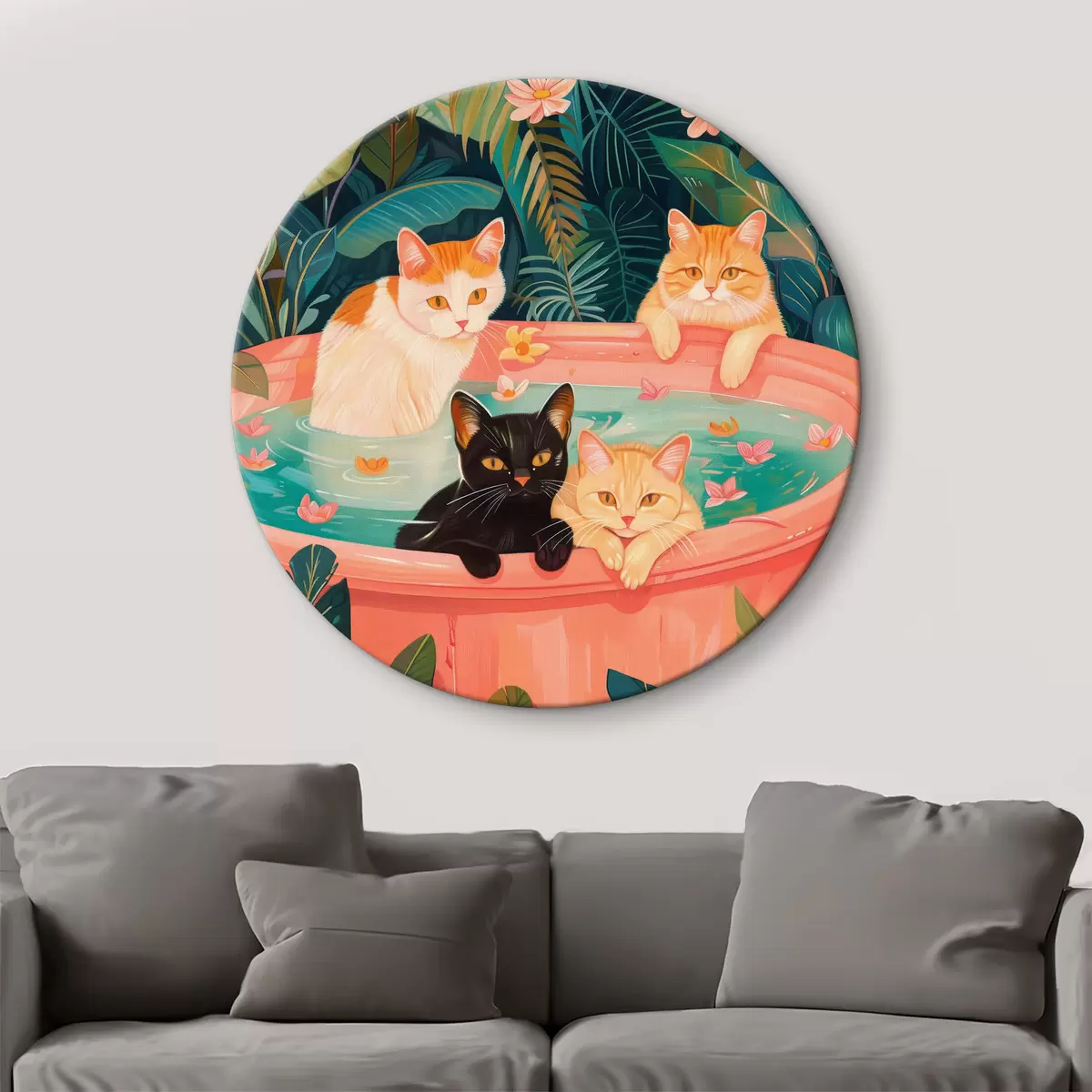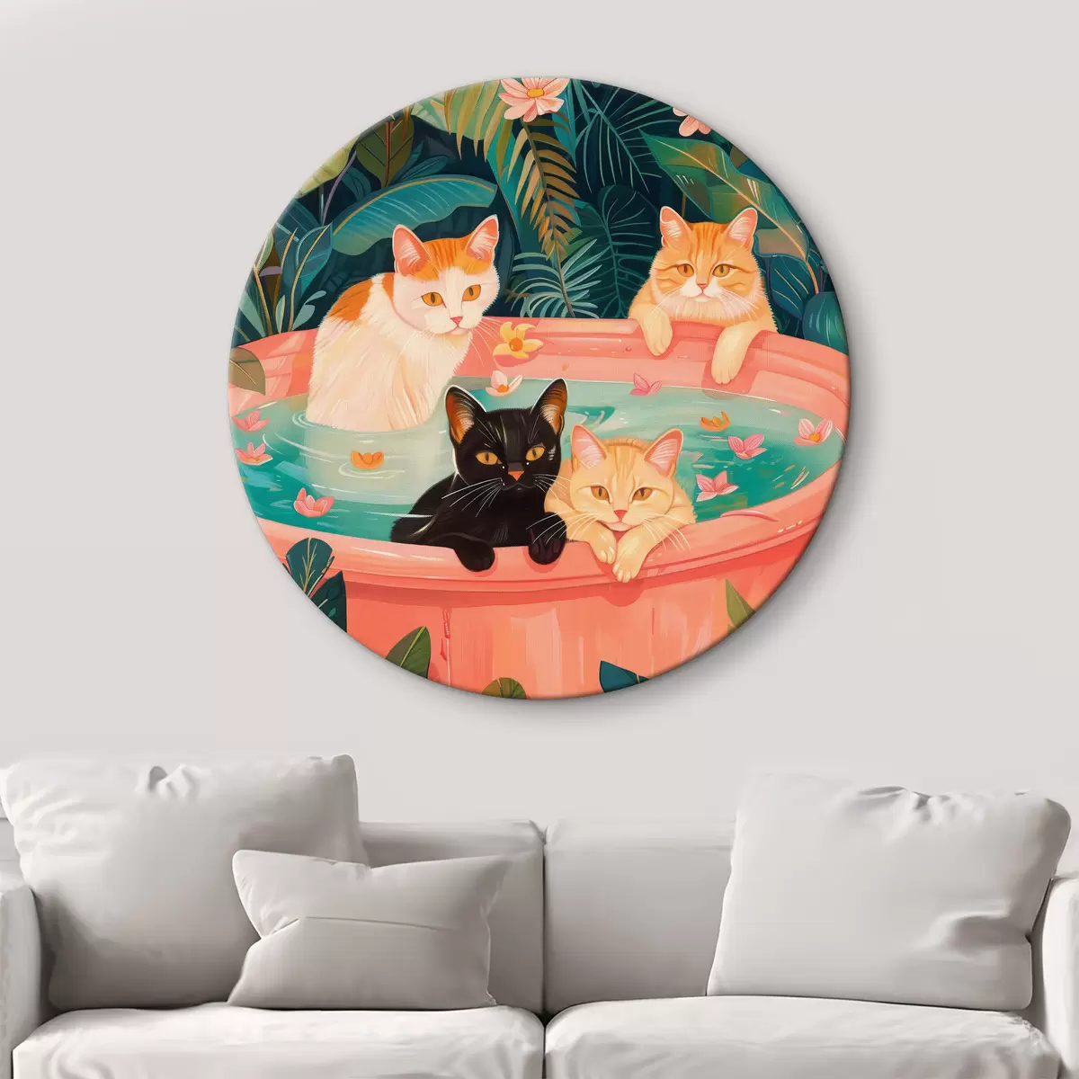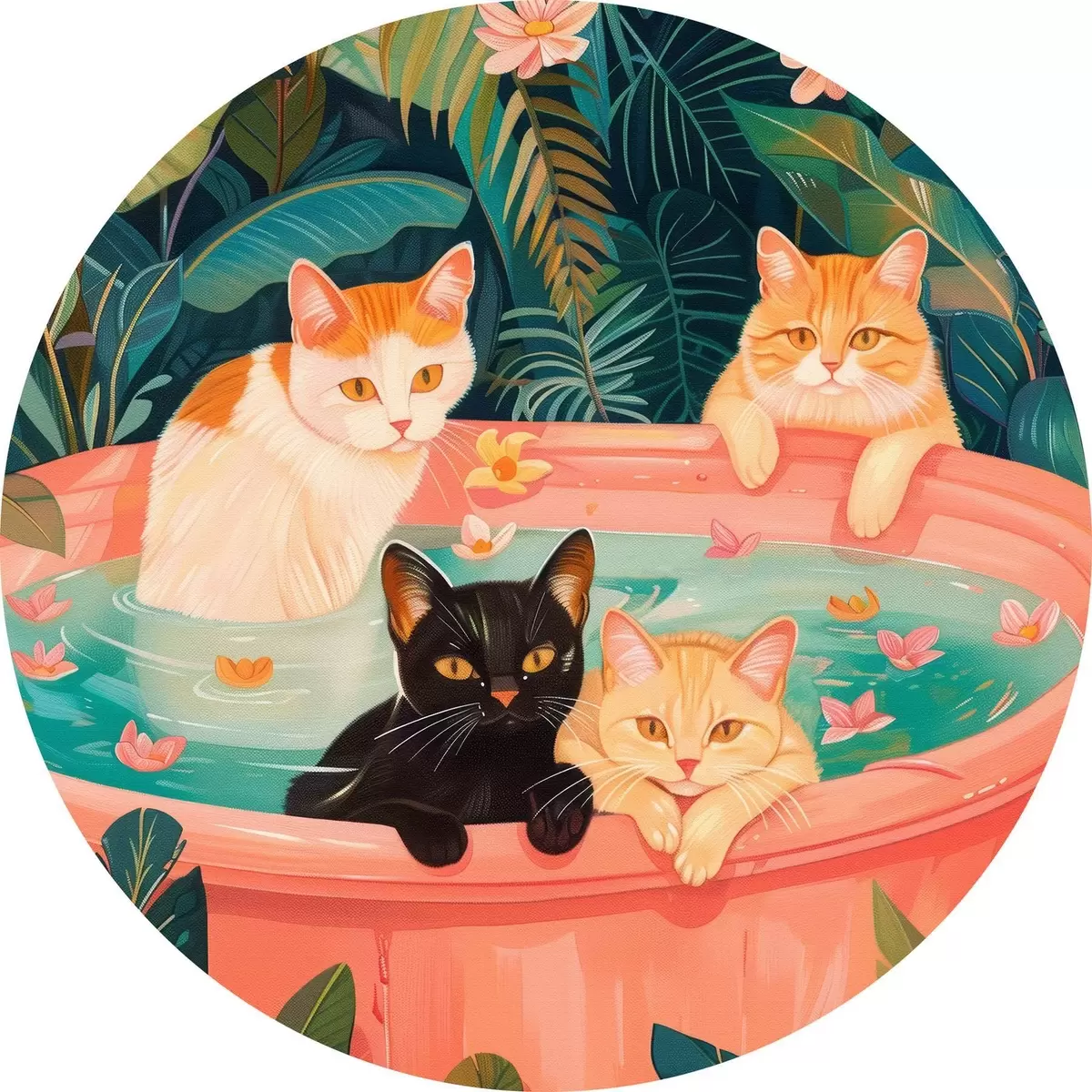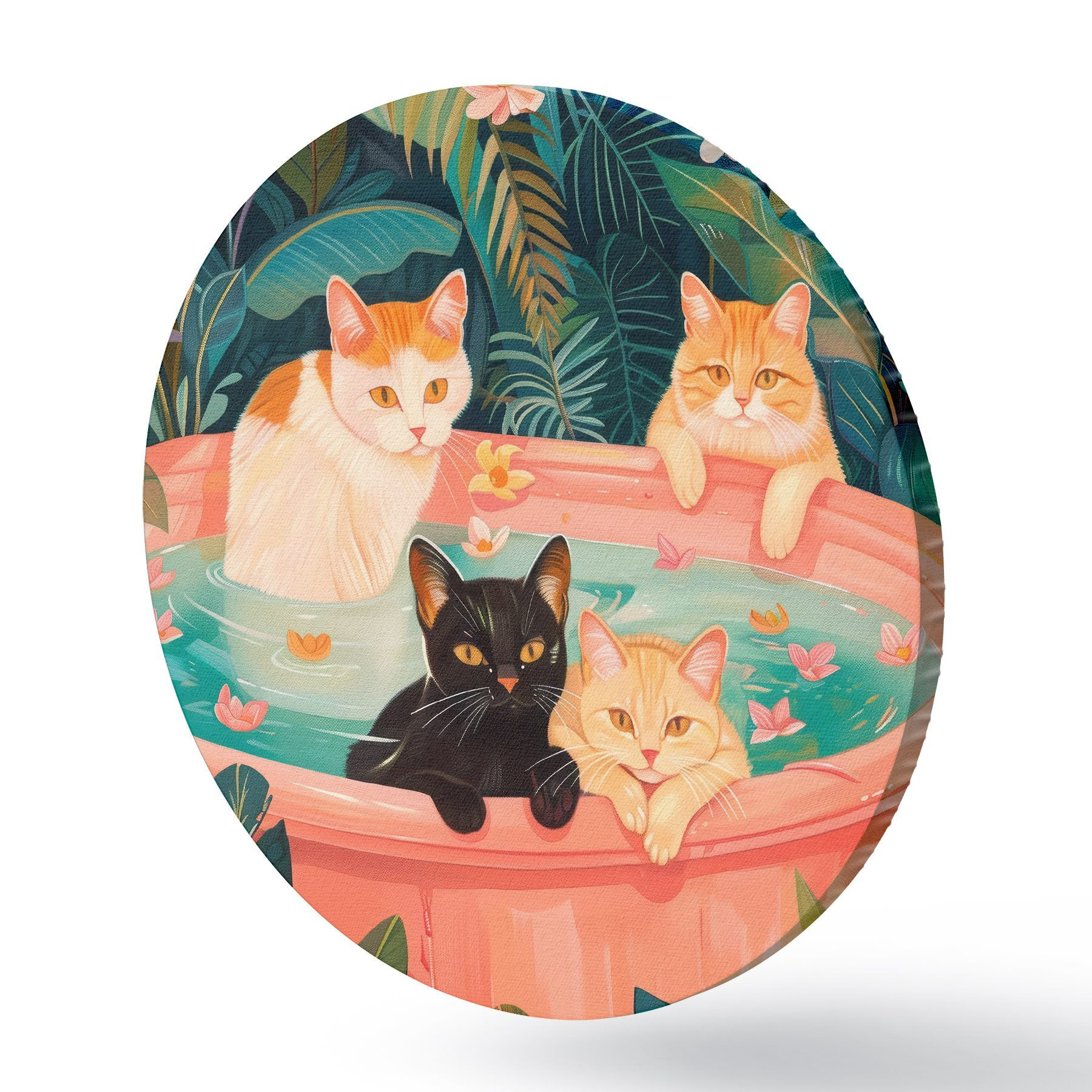 Quadri rotondi Gatti in un bagno rosa con foglie verdi, atmosfera da giungla r39465