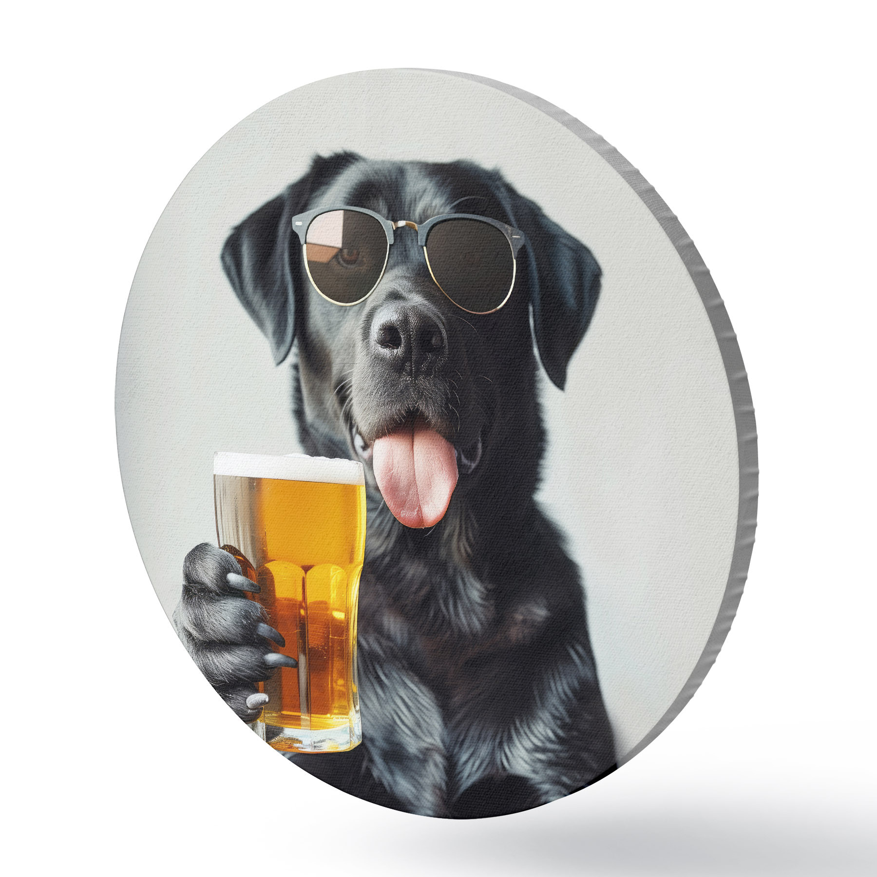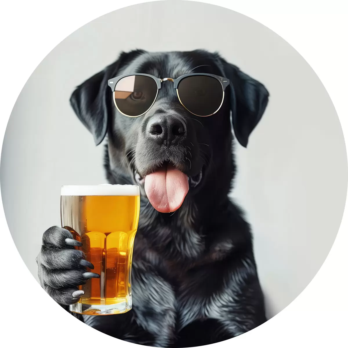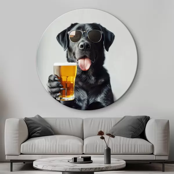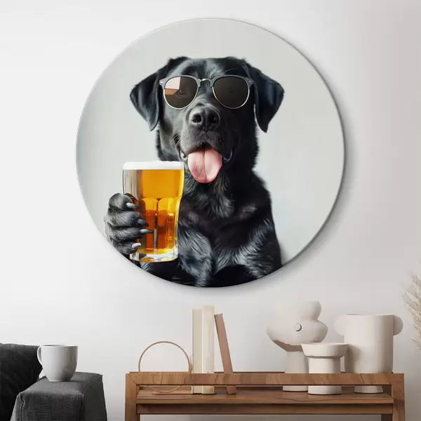 Quadri rotondi Ritratto di un labrador nero che indossa occhiali da sole e tiene in mano una pinta di birra, guardando dritto nella telecamera r39470