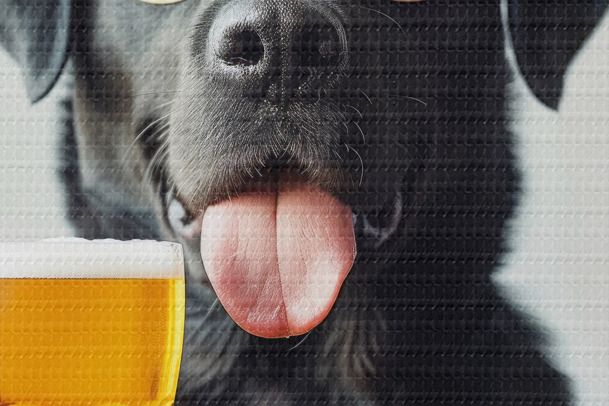 Immagine Ritratto di un labrador nero che indossa occhiali da sole e tiene in mano una pinta di birra, guardando dritto nella telecamera Nr r39470