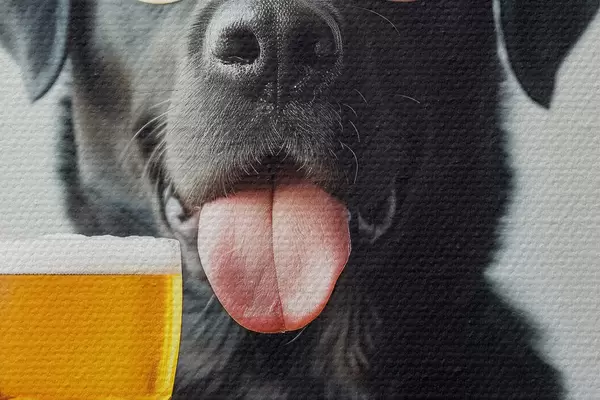 Immagine Ritratto di un labrador nero che indossa occhiali da sole e tiene in mano una pinta di birra, guardando dritto nella telecamera Nr r39470