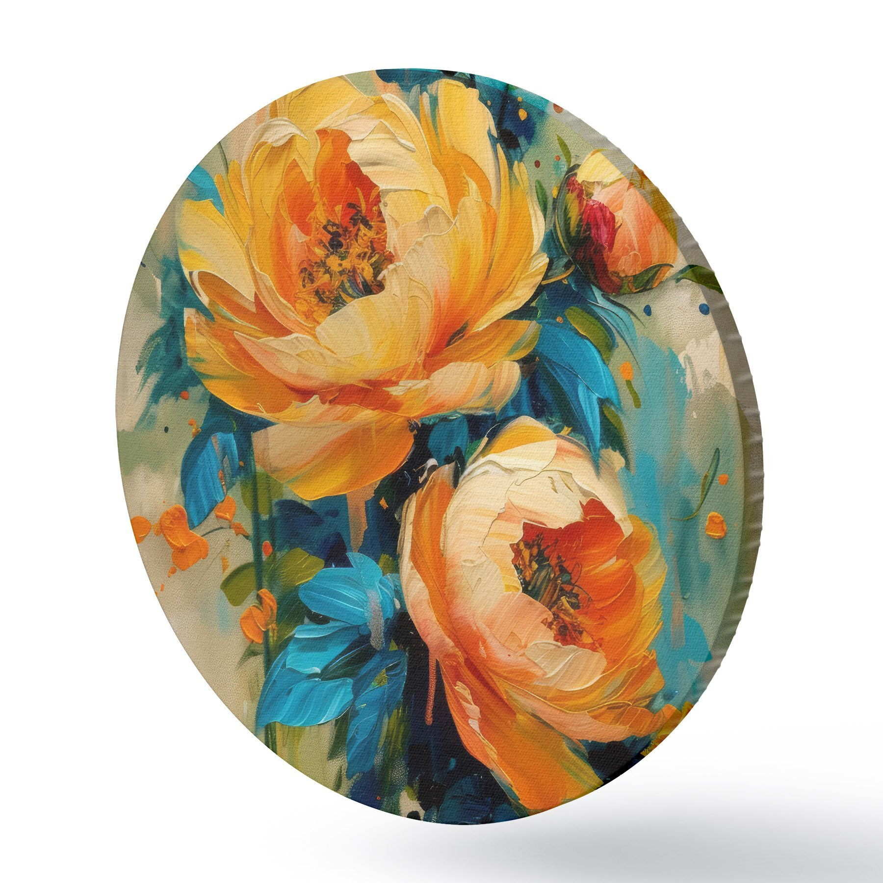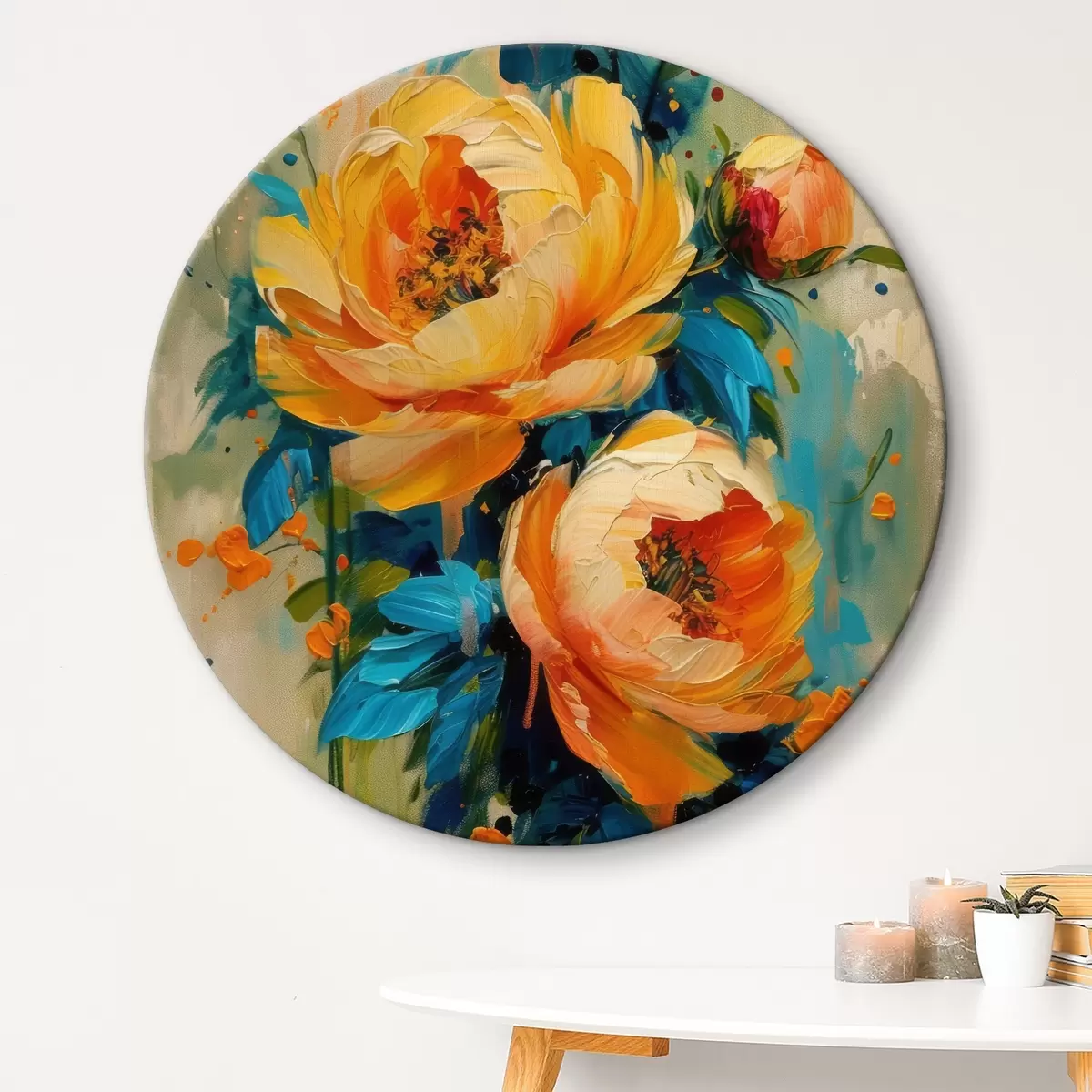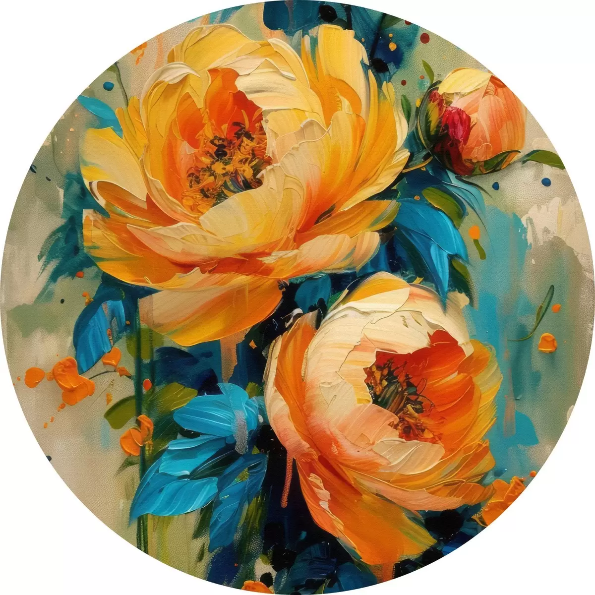Quadri rotondi Quadro astratto nei toni del beige, giallo, blu, verde salvia con schizzi di arancione, peonie vivaci in estate r39472