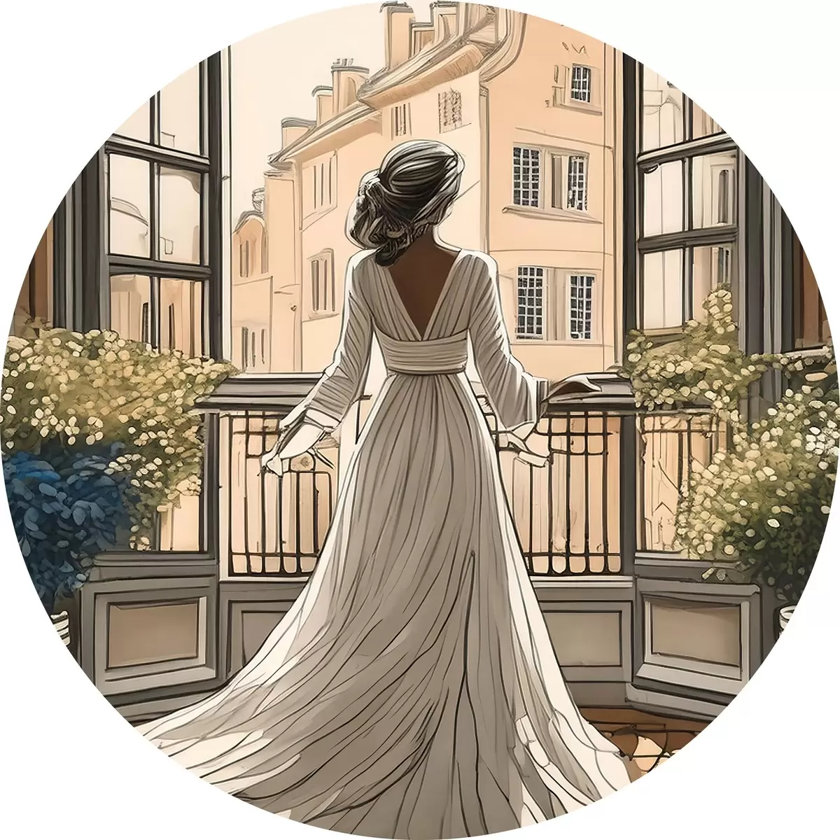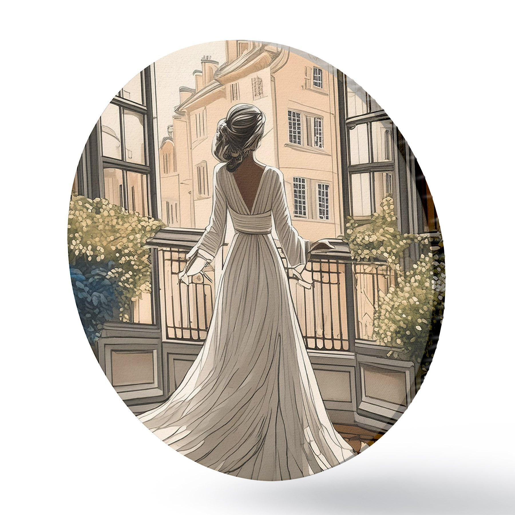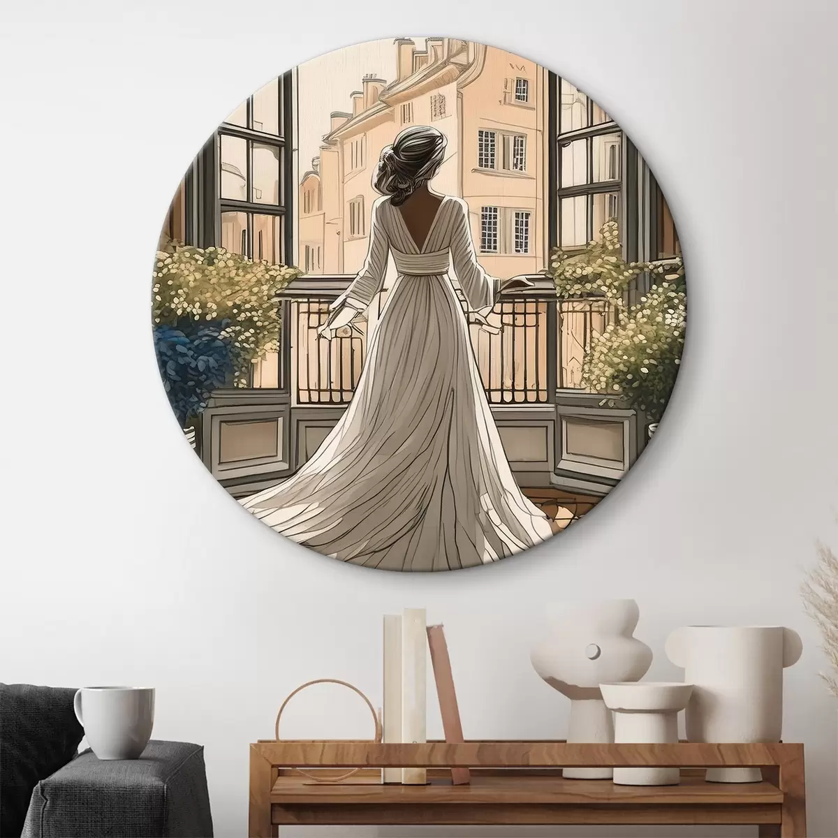 Quadri rotondi sagoma di una ragazza in abito bianco vicino a una grande finestra r39480