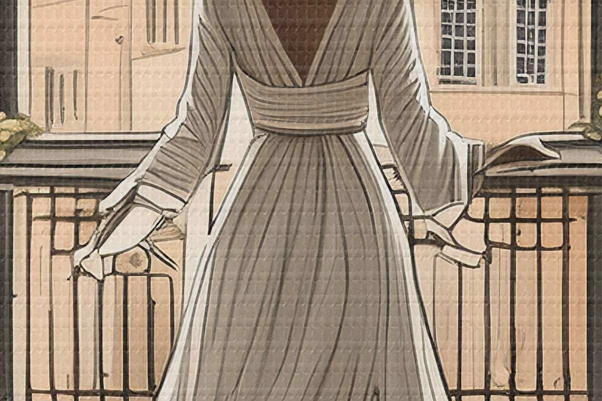 Immagine sagoma di una ragazza in abito bianco vicino a una grande finestra Nr r39480